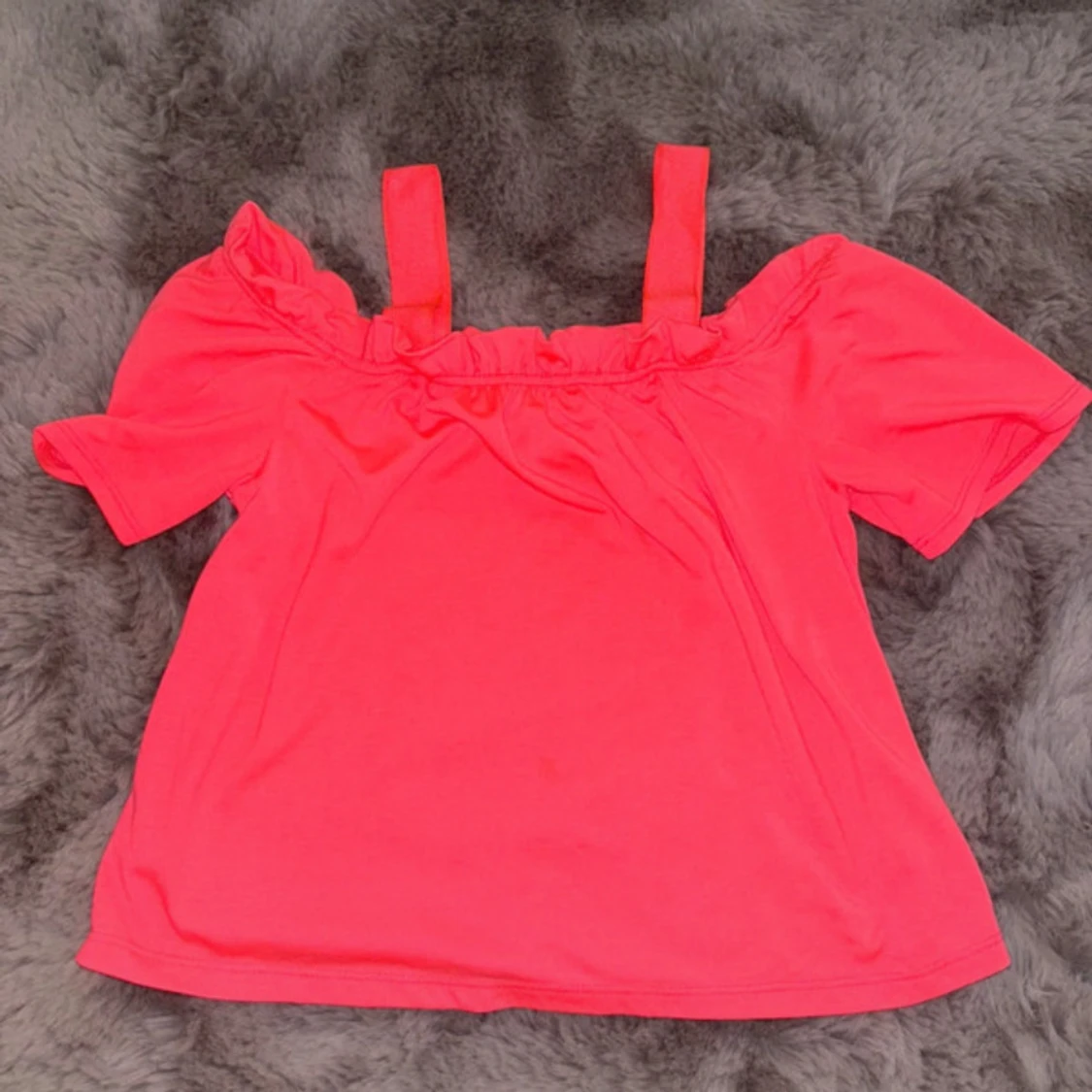 Snygg neonrosa topp med offshoulder-design och breda axelband. Toppen har korta ärmar och en lätt rynkad kant upptill som ger en cool och trendig look. Perfekt för dig som vill sticka ut med färg och stil.