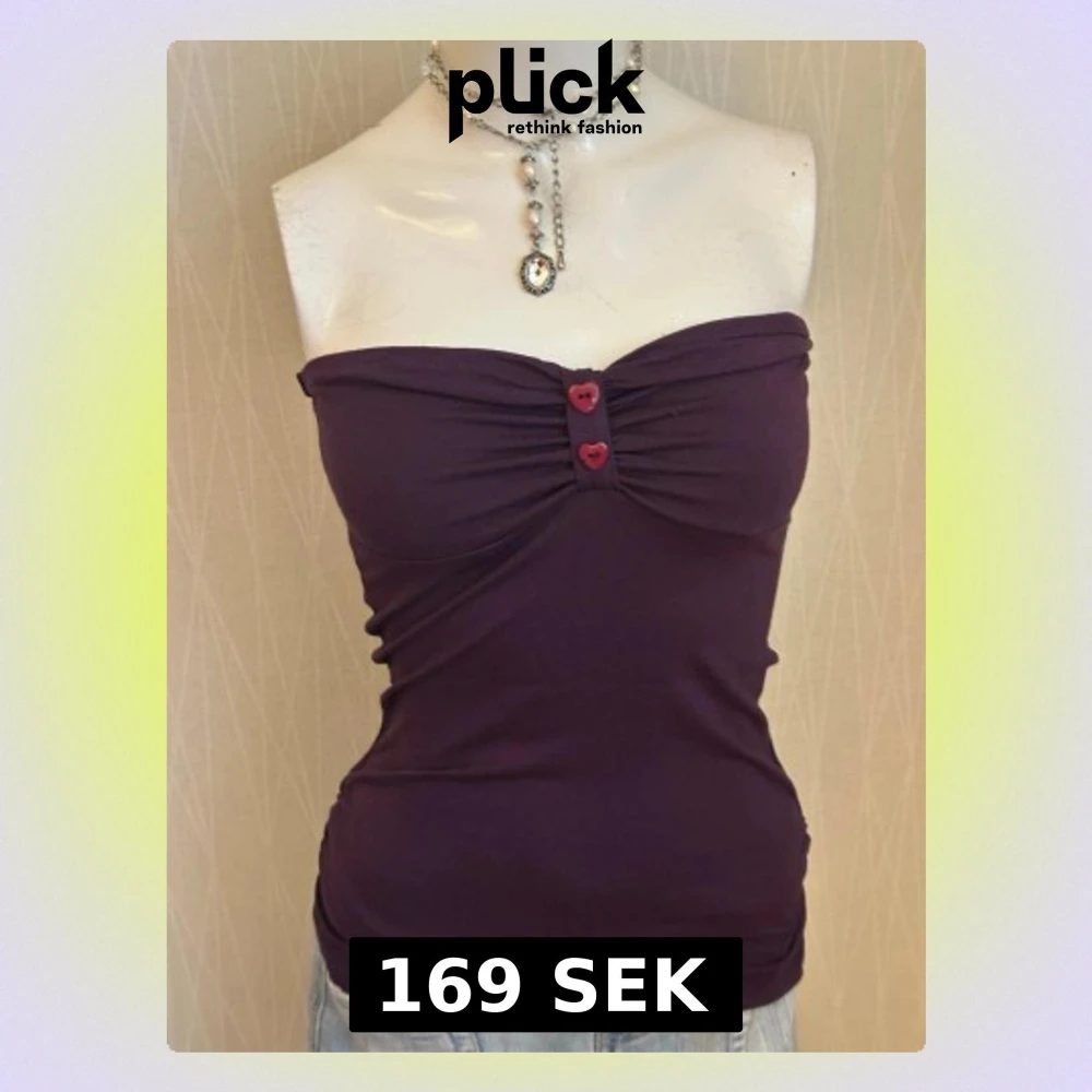 Snygg mörklila tubtopp med två dekorativa röda knappar framtill. Toppen är bandeau-modell och har en tight passform som framhäver figuren. Perfekt att matcha med jeans eller kjol för en trendig look.