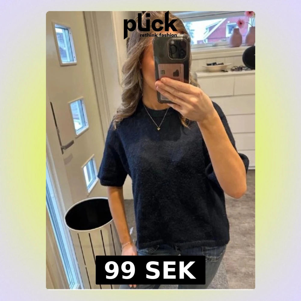 Mysig mörkblå stickad topp med korta ärmar och rund hals. Perfekt till jeans och enkel att styla med smycken. Materialet känns mjukt och ger en avslappnad men ändå snygg look.