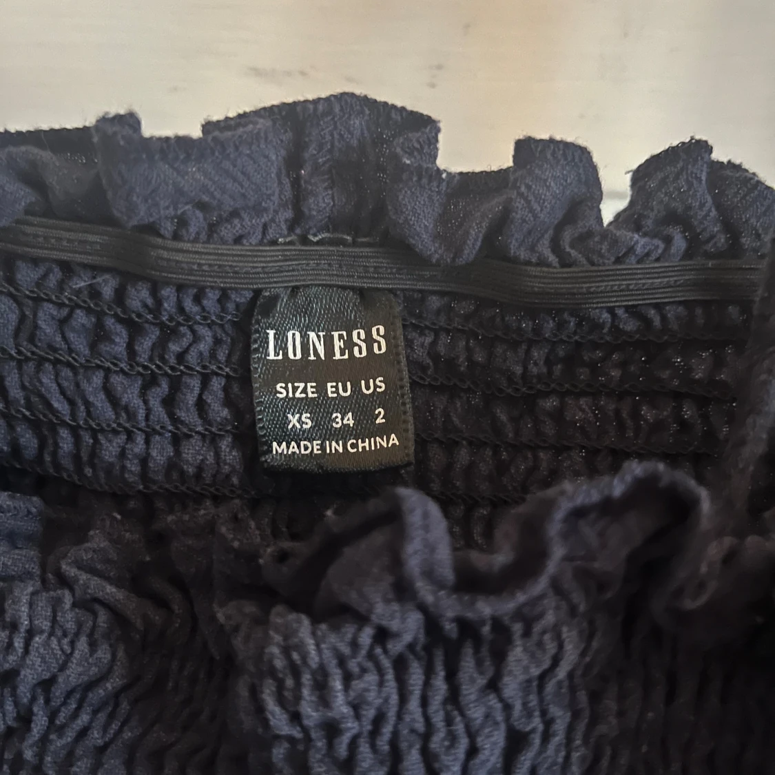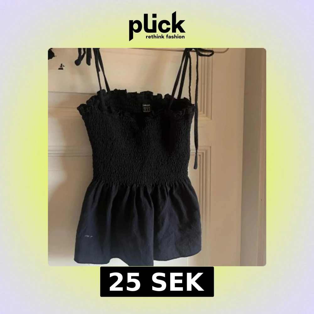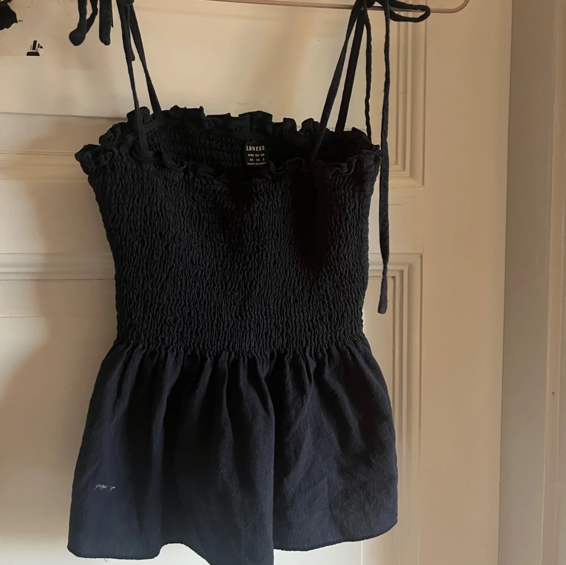 Supersöt svart linnetopp från Loness med smockad överdel och volangkant upptill. Toppen har tunna axelband som knyts och en lätt utställd nederdel. Perfekt för en trendig och avslappnad look.