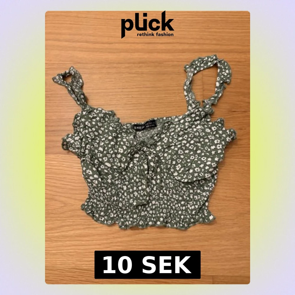 Supersöt grön croppad topp från SHEIN i storlek XS med vita små blommor, smockad midja och volangkant. Axelbanden är knutna och toppen har en liten rosett framtill. Perfekt för varma dagar och ger en riktigt somrig vibe.