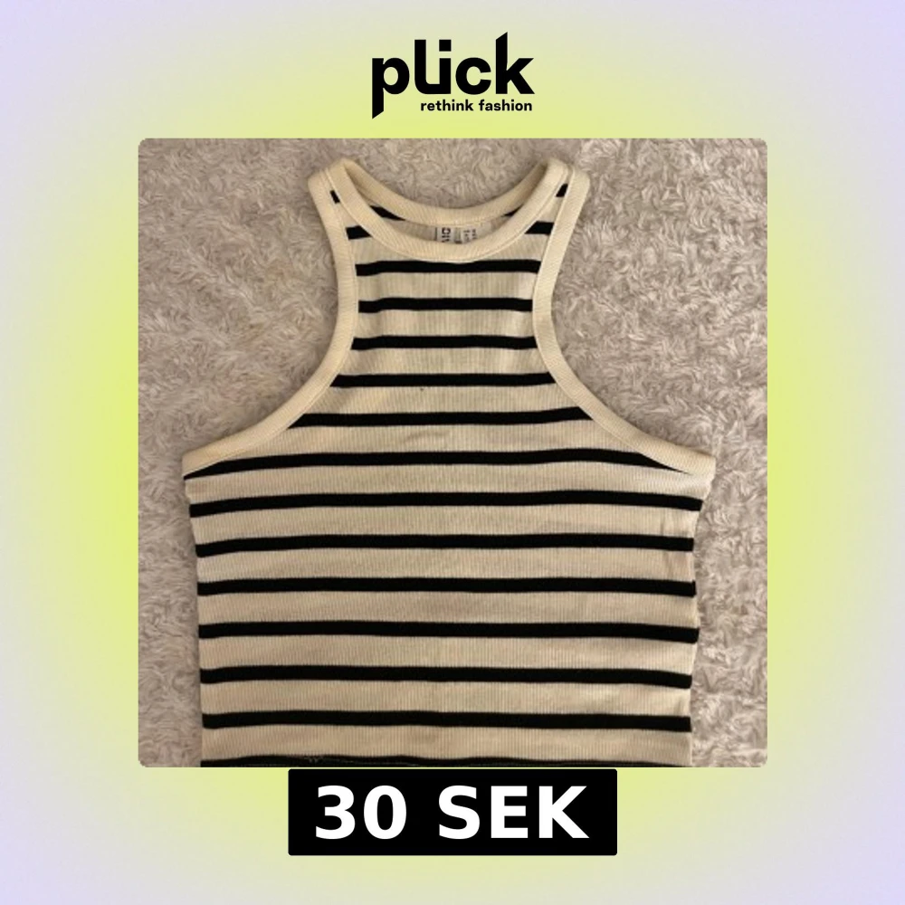 Säljer en ribbad linnetopp med svarta och vita ränder. Toppen har en tight passform och är ärmlös med brottarrygg.