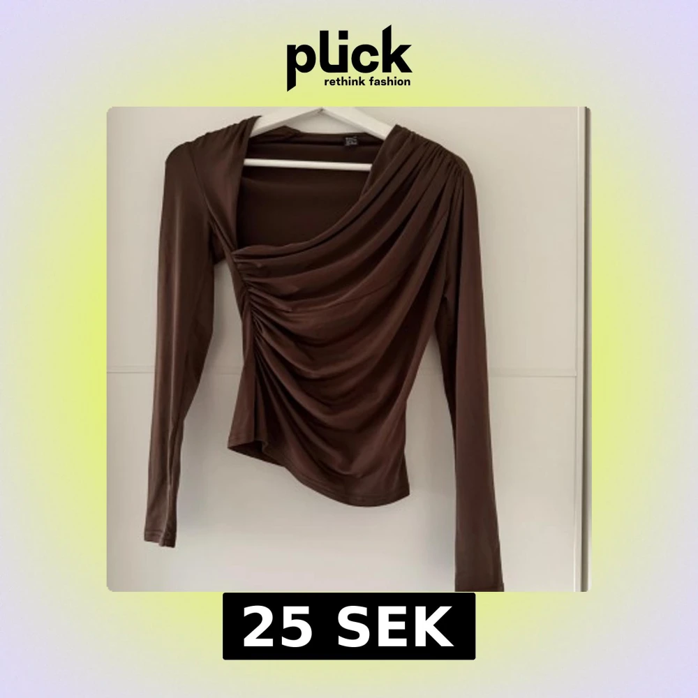 Säljer en brun topp från SHEIN i storlek XS. Toppen har långa ärmar, draperad framsida och asymmetrisk skärning. Tillverkad i ett mjukt, stretchigt syntetmaterial som sitter snyggt på kroppen. Perfekt för dig som gillar trendiga detaljer och en cool look.