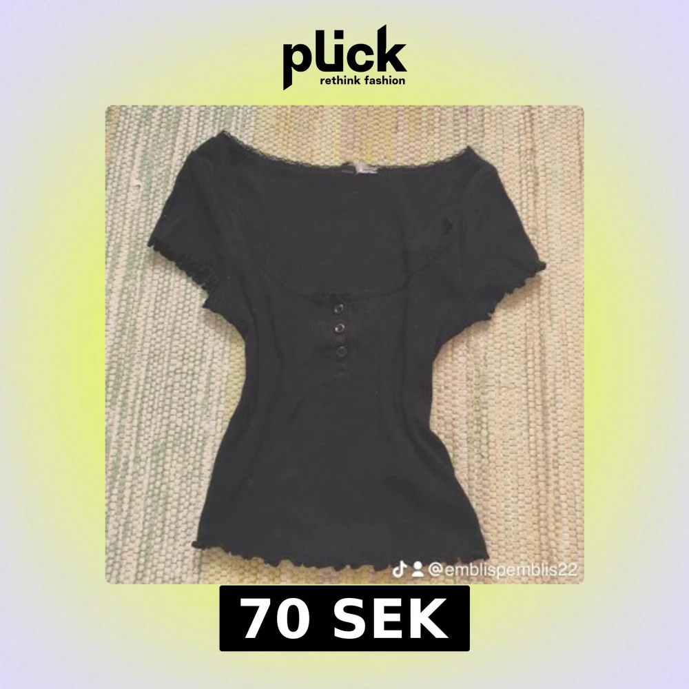 Supersöt svart ribbad topp med korta ärmar, dekorativa knappar framtill och spetskant runt den vida urringningen. Ärmsluten har volangdetaljer som ger en gullig touch. Perfekt för dig som gillar en feminin och trendig stil. Från H&M