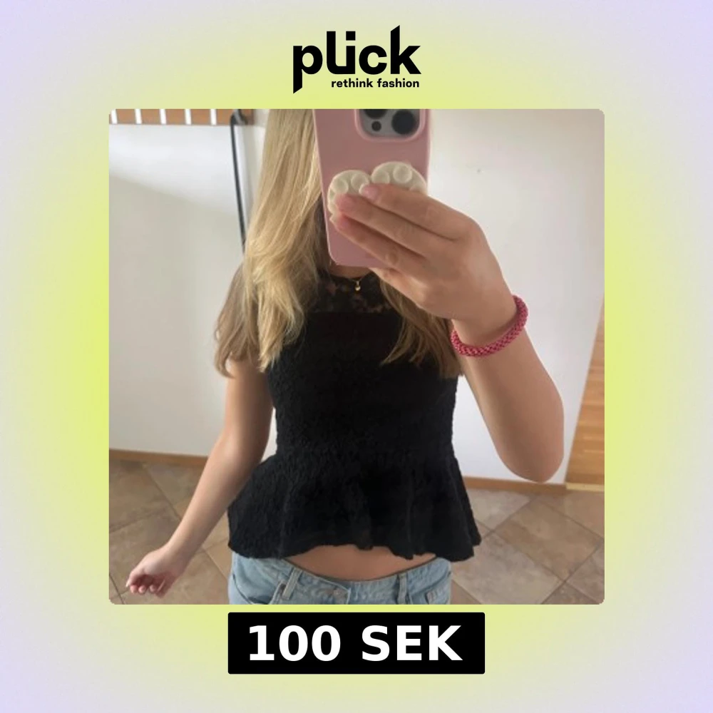 Supersöt svart blus i spets med volang nertill. Blusen är ärmlös och har en feminin, croppad passform som ger en snygg siluett. Perfekt att styla med jeans eller kjol för en trendig look. jag har S och den passar mig bra.