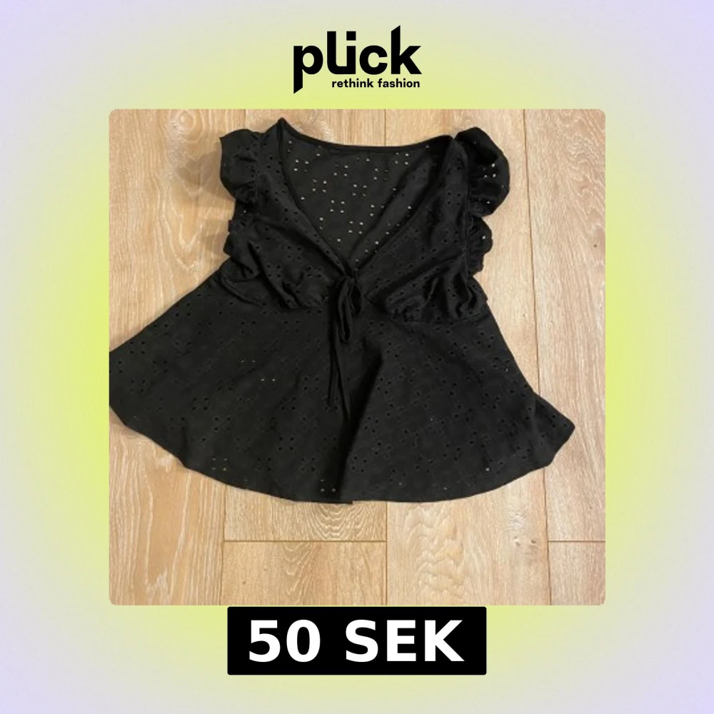 Snygg svart blus med broderade hål och volangdetaljer vid axlarna. Djup v-ringning och knyt framtill ger en feminin touch. Perfekt för dig som gillar en luftig och trendig stil.