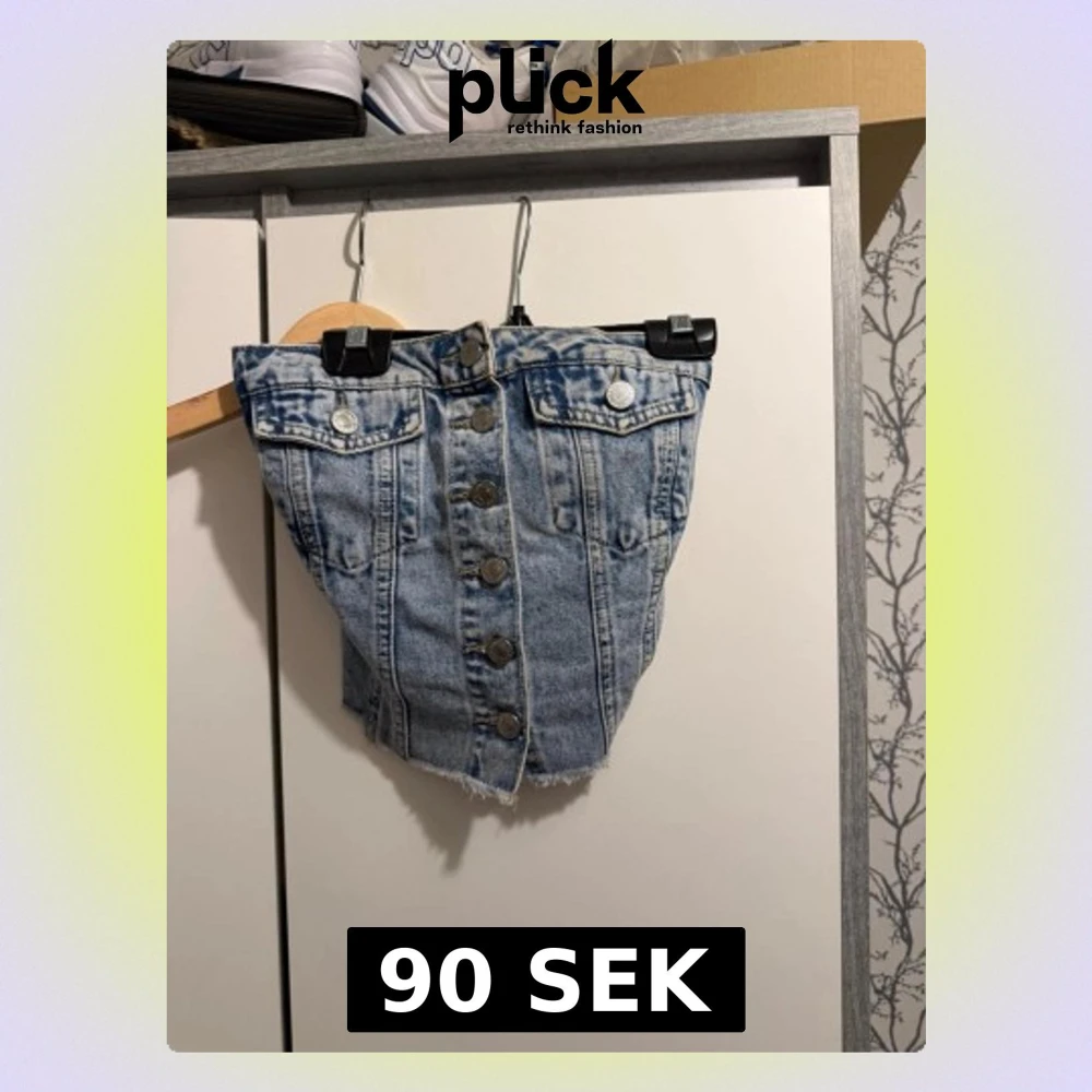 Säljer en ljusblå tubtopp i denim med knappar framtill och rå kant nertill. Toppen har två bröstfickor med knappdetaljer och smockad rygg för extra bekväm passform. Perfekt för dig som vill ha en unik och edgy jeanslook.