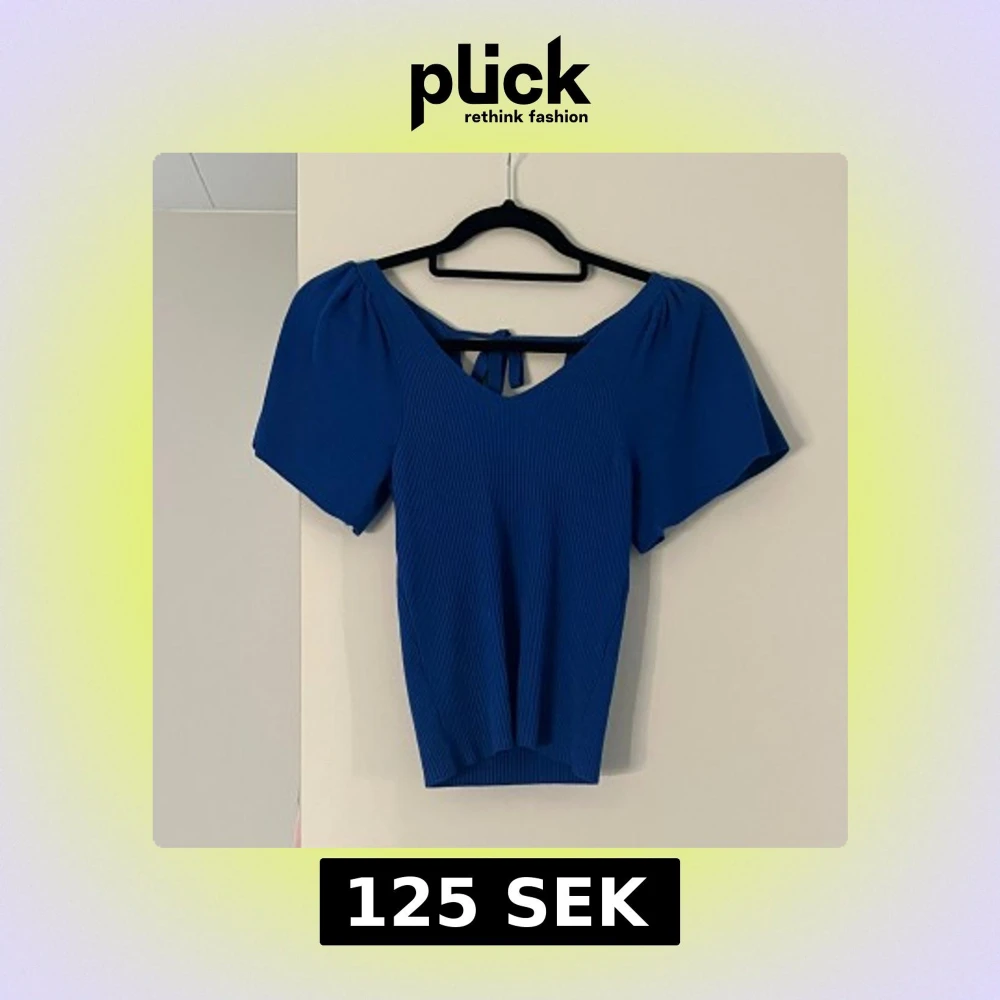 Snygg blå ribbad topp med korta ärmar och v-ringning. Toppen har en fin knytning i ryggen och är i storlek xs. Den är stretchig och sista bilden är för att se hur den ser ut på💕