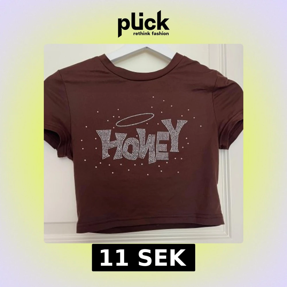 Croppad brun topp från SHEIN med korta ärmar och coolt strassmönster framtill där det står 'HONEY' och en glittrig gloria ovanför. T-shirten är i mjuk bomull och har en figurnära passform som sitter snyggt till höga jeans eller kjol.