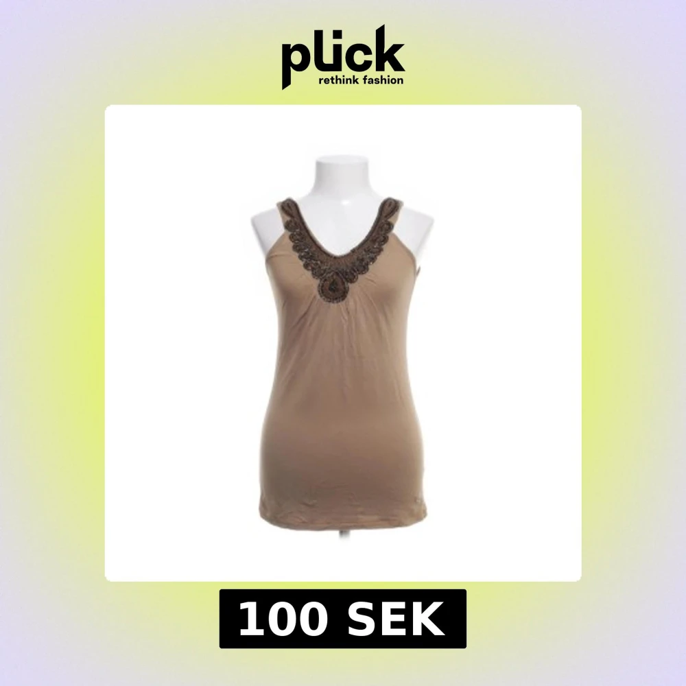 Snygg beige linnetopp med djup v-ringning och dekorativa pärldetaljer i brunt och svart längs halsringningen. Toppen är ärmlös och har en smickrande passform som passar perfekt till sommaren.