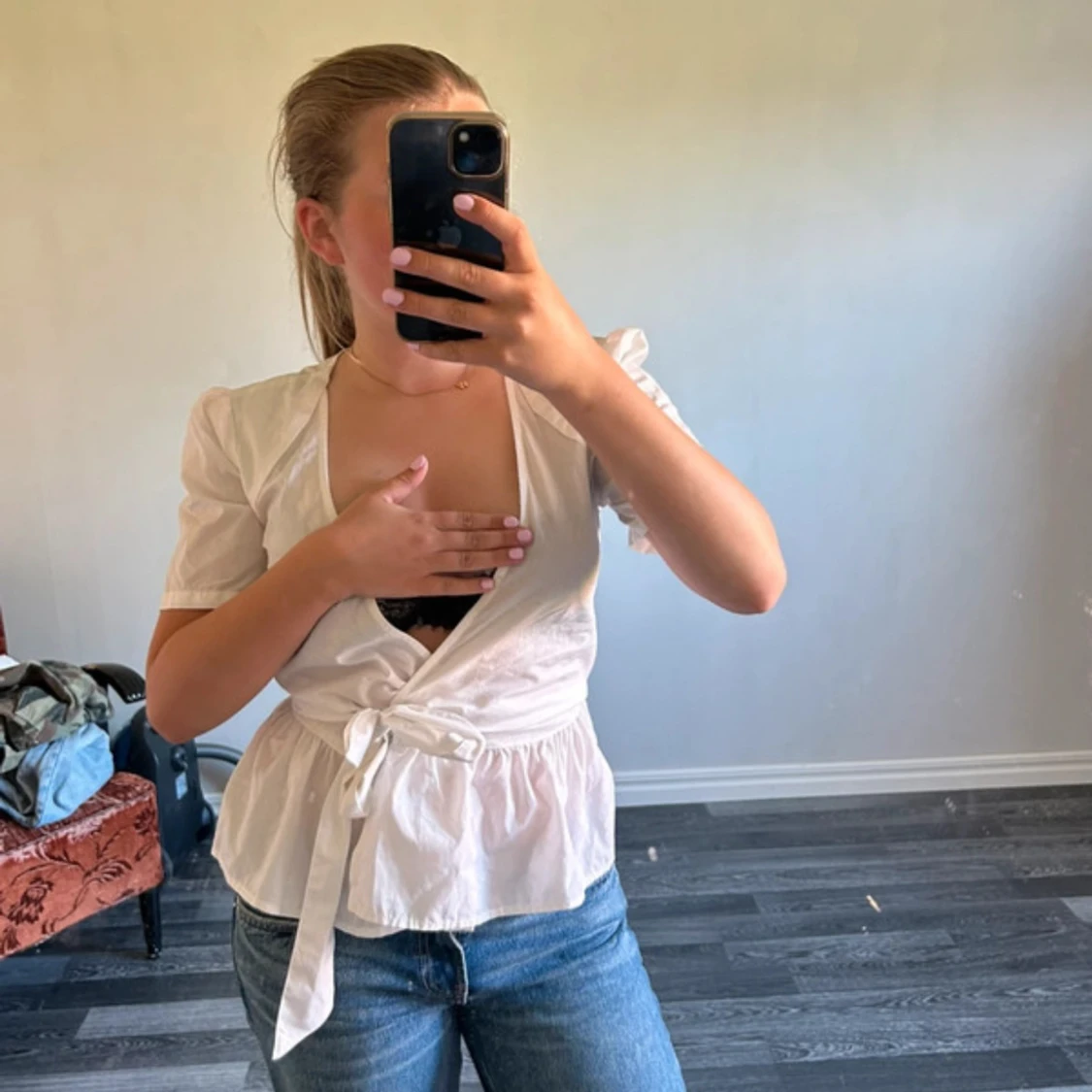 Säljer en vit omlottblus med korta puffärmar och knyt i midjan. Blusen har v-ringad hals och ett lätt rynkat parti nedtill som ger en söt siluett. Perfekt till jeans eller kjol för en fräsch look. Otrolig snygg men för liten för mig över bysten som har D i kupa
