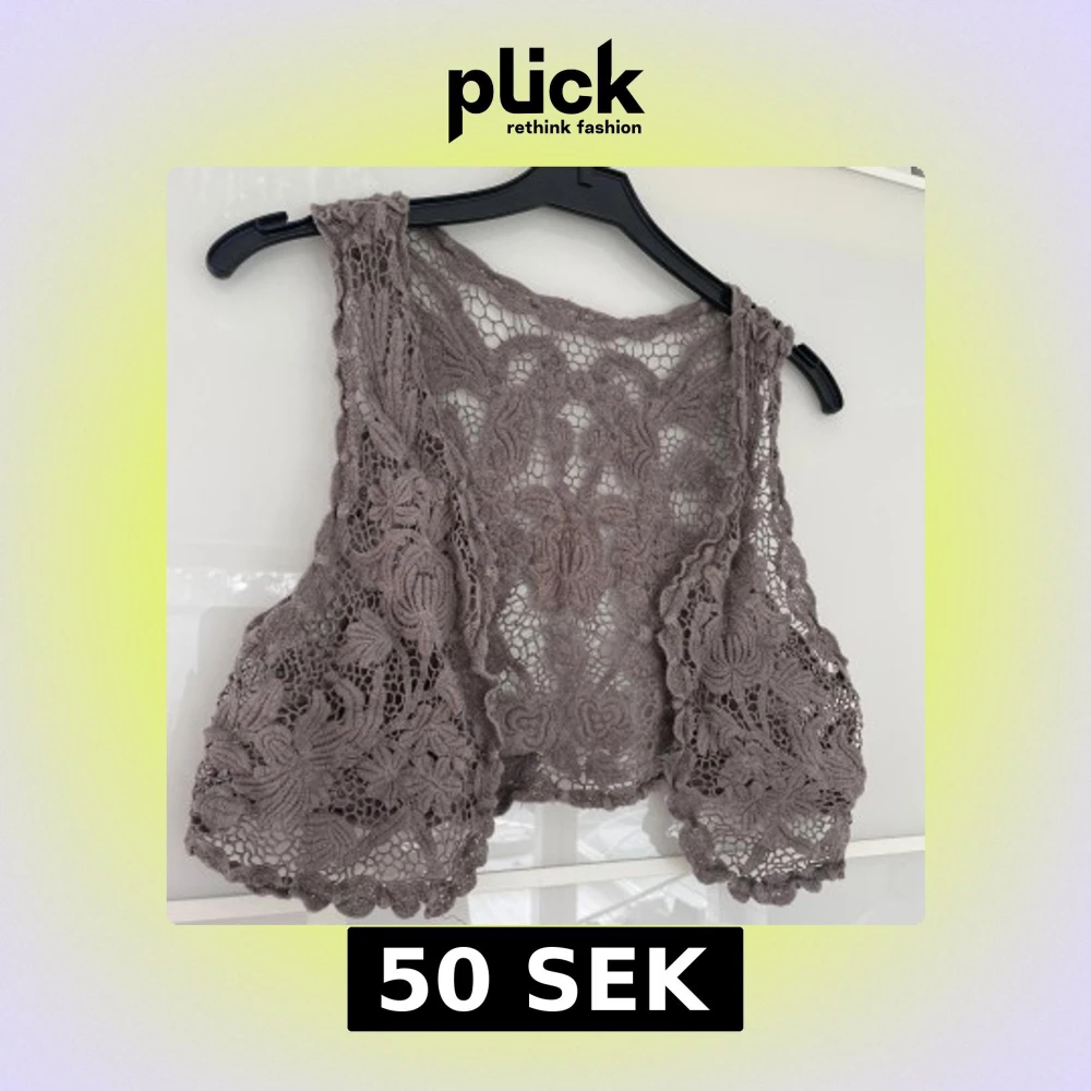 Säljer en grå väst i spets med vackert blommigt mönster. Västen är kort och har en öppen front, perfekt för att lägga till en romantisk touch till din outfit.