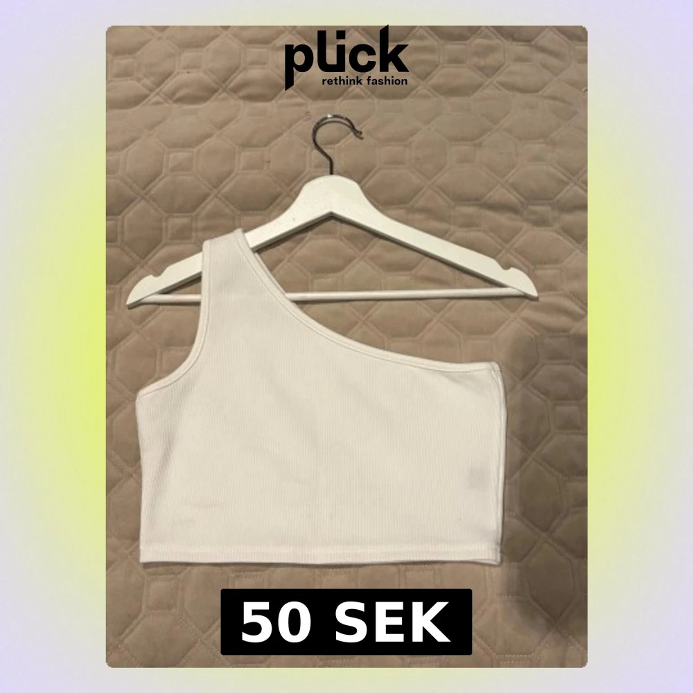 Säljer en vit ribbad oneshoulder topp som är croppad och har en snygg asymmetrisk design. Perfekt för dig som gillar minimalistisk stil och vill ha något som sticker ut lite. Materialet är mjukt och stretchigt, vilket gör den bekväm att bära.