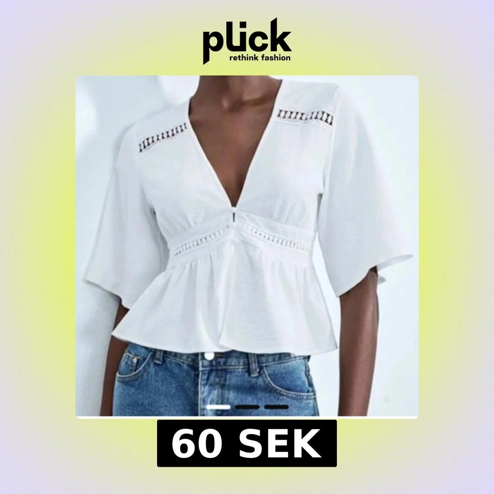 Superfin vit blus med djup v-ringning och korta ärmar. Blusen har spetsdetaljer vid axlar och en volang nertill.