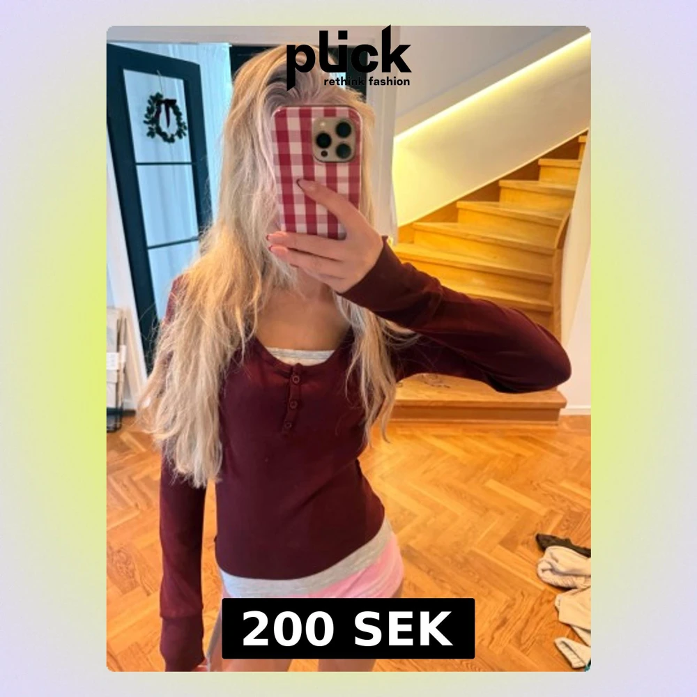 Säljer en vinröd långärmad topp med rundad ringning och tre knappar framtill. Modellen är figurnära och toppen är i ett mjukt, stretchigt material som känns skönt mot huden. Perfekt att styla med jeans eller kjol för en enkel look.