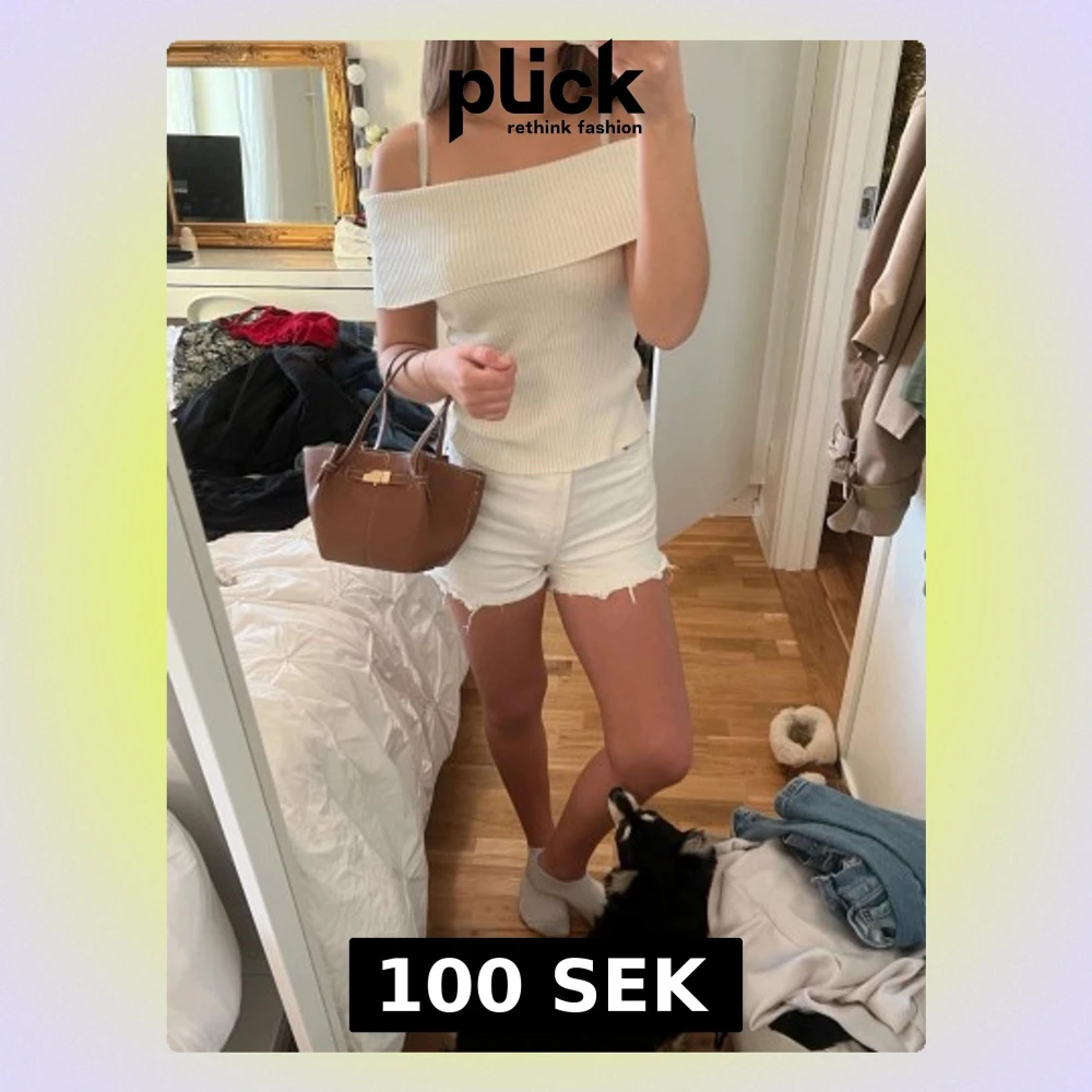 Säljer en vit ribbad topp med offshoulder-design och smala axelband. Toppen har en bred, vikt kant över axlarna och är figurnära med en croppad passform. Perfekt för sommarens alla tillfällen och enkel att matcha med shorts eller jeans.