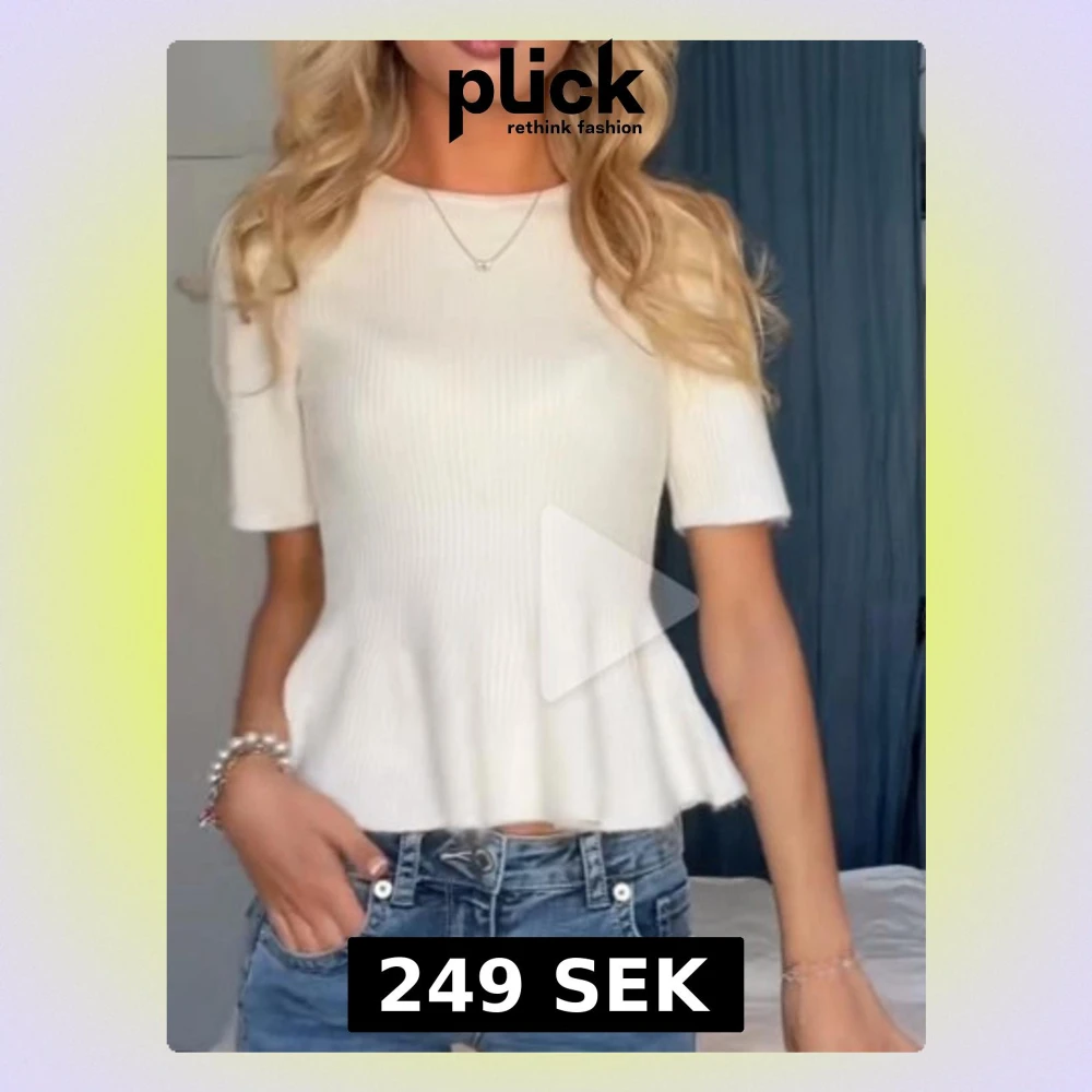 Säljer en söt vit topp med ribbad struktur och volangkant nedtill. Toppen har rund hals och korta ärmar, vilket ger en fräsch och feminin look. Perfekt att matcha med jeans eller kjol för en trendig stil.