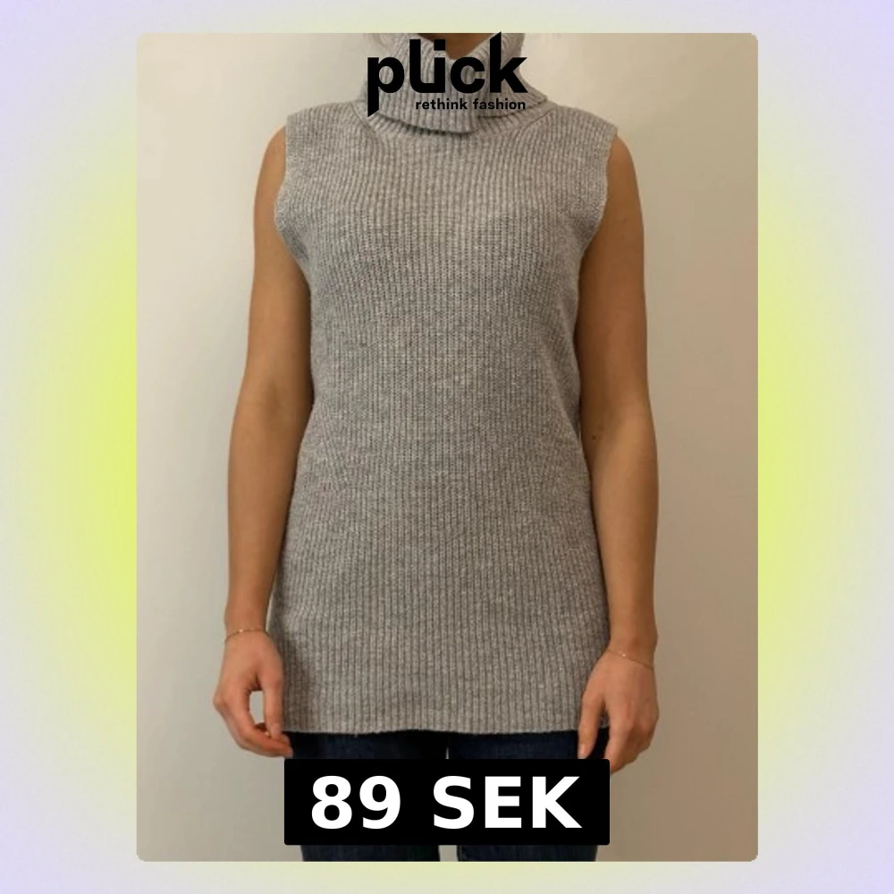Säljer en grå, ribbstickad ärmlös polotröja med hög krage. Tröjan är lång i modellen och har slitsar i sidorna för en snygg passform. Perfekt att styla över en skjorta eller med jeans för en trendig lager-på-lager-look.