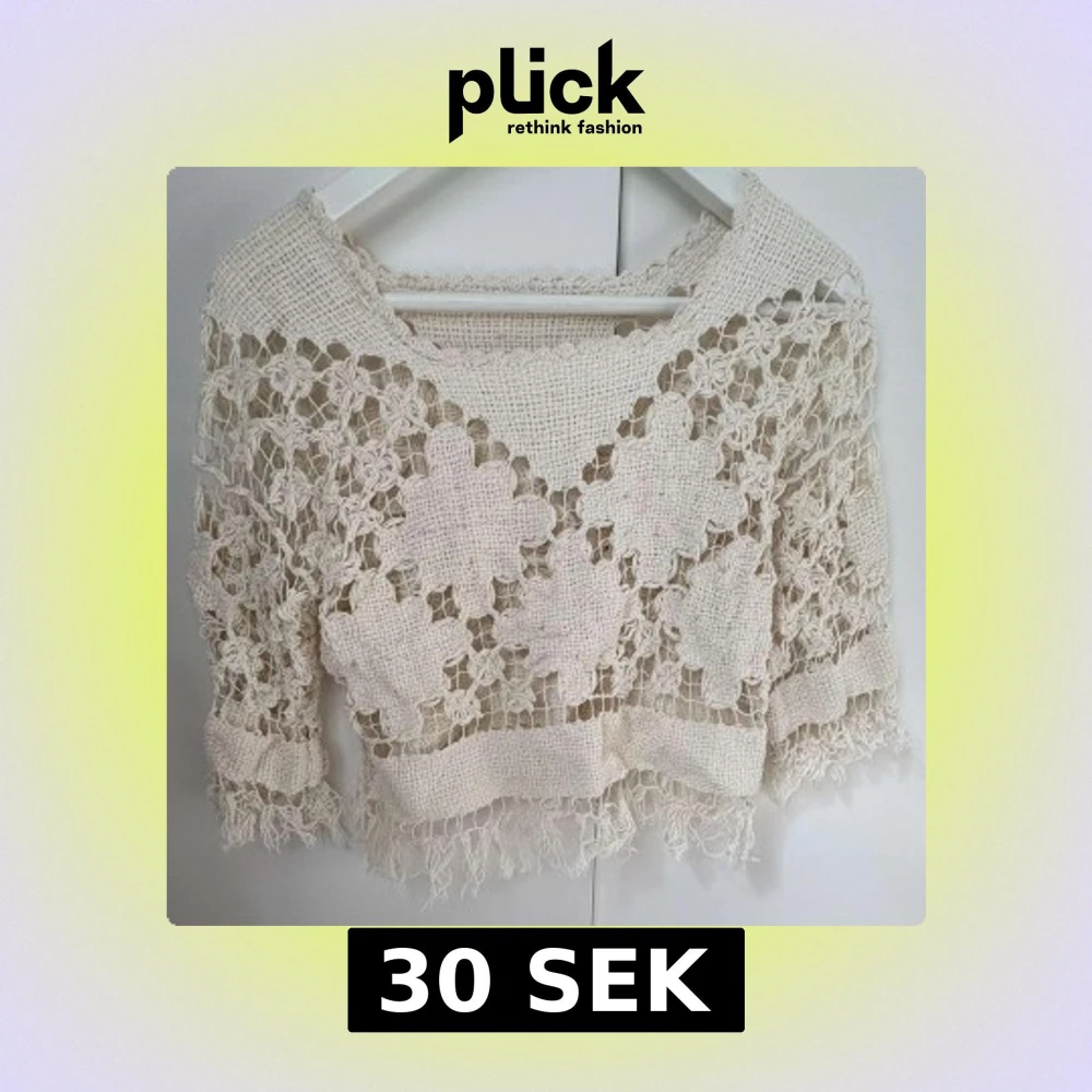 Superfin beige virkad blus med croppad passform och trekvartsärm. Blusen har ett unikt blommigt mönster och fransar längs nederkanten. Perfekt för dig som gillar boho vibes och vill sticka ut med coola detaljer.