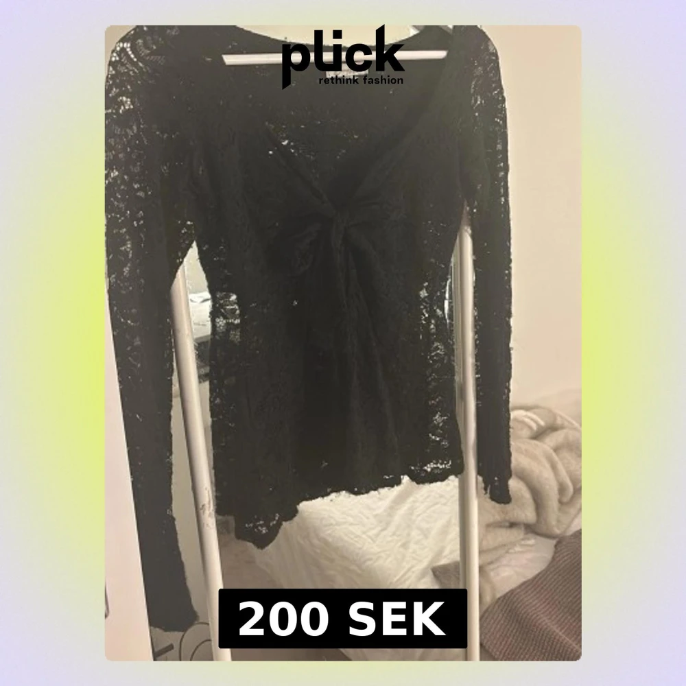 Snygg svart långärmad topp i spets från Brisli. Modellen har djup urringning och en knut framtill. Hela toppen är genombruten med blommigt spetsmönster och har en feminin, figurnära passform. Perfekt för att lyfta vilken outfit som helst. (Har defekter på toppen)