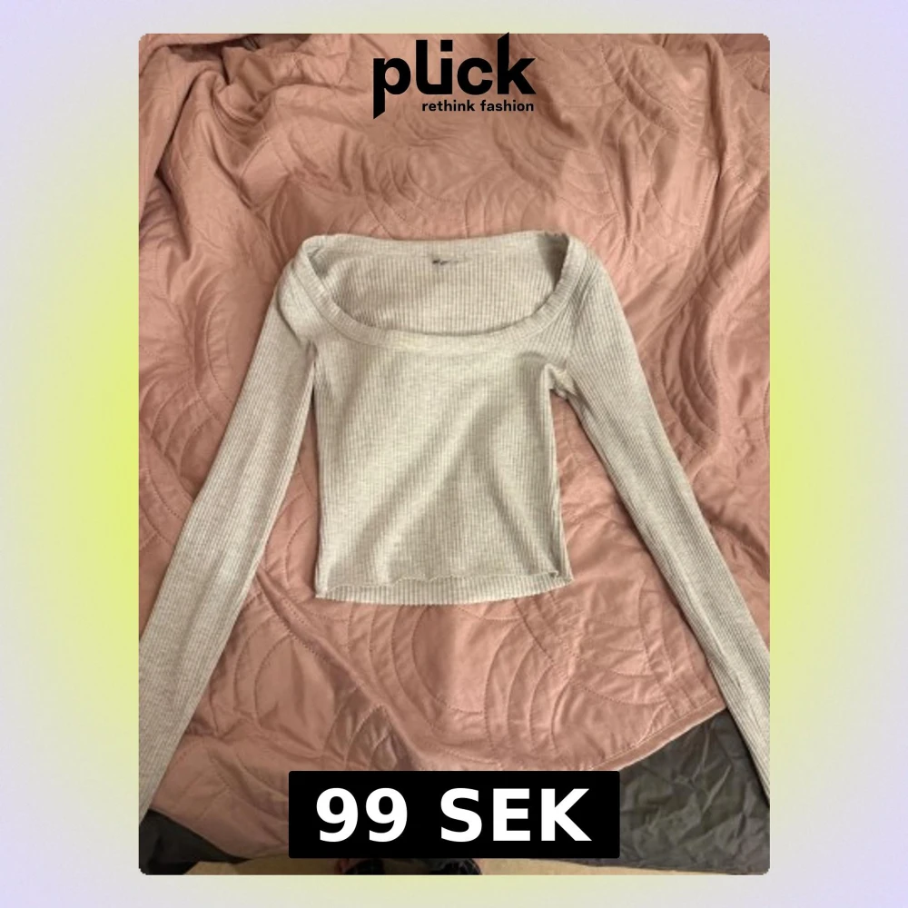 Säljer en ljusgrå ribbad topp med lång ärm och bred, rundad halsringning.