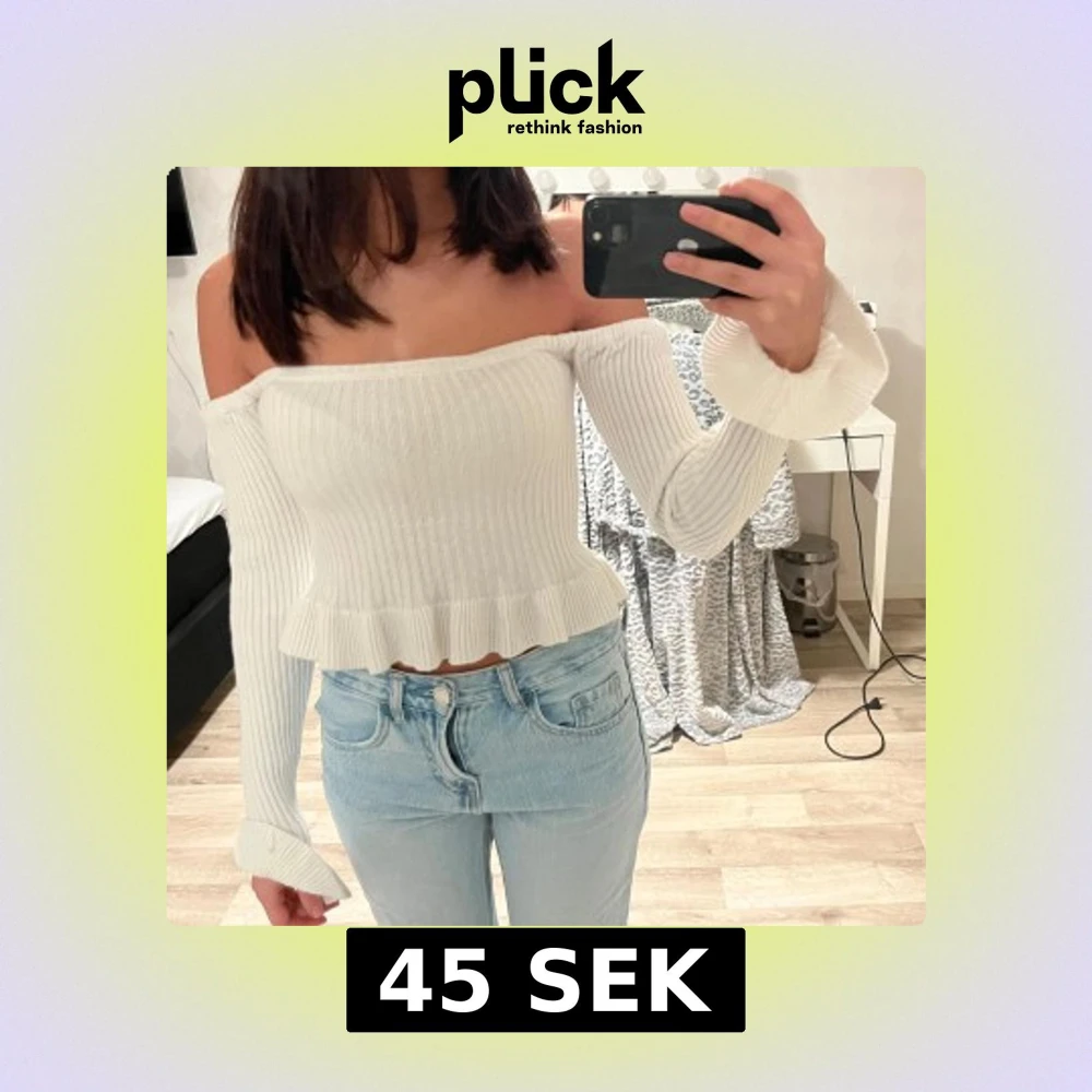 Säljer en stilren vit ribbad offshoulder topp med långa ärmar och volangdetaljer vid ärmslut och nederkant. Perfekt för en trendig look!
