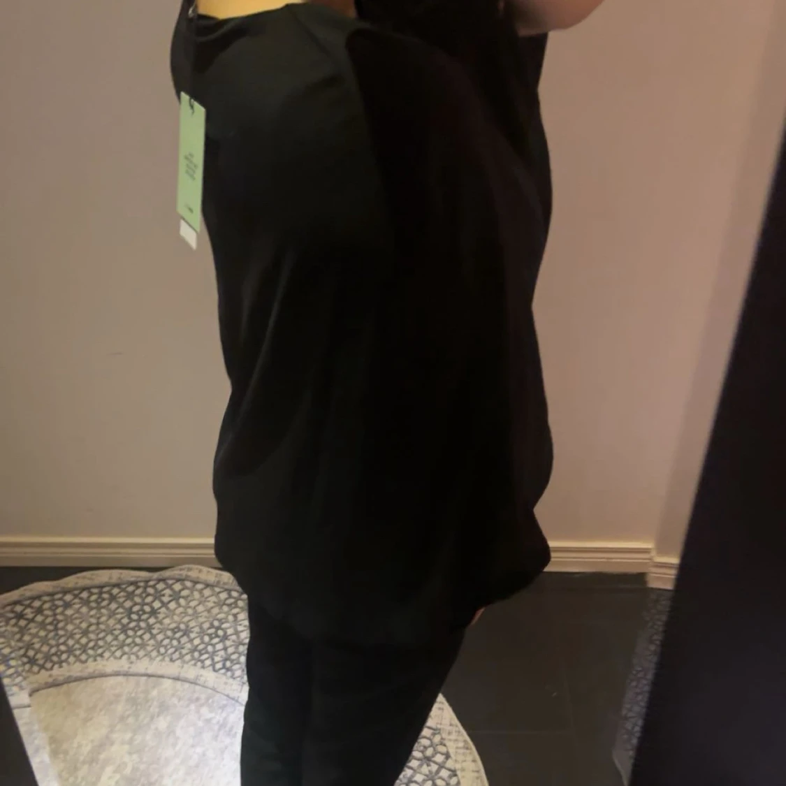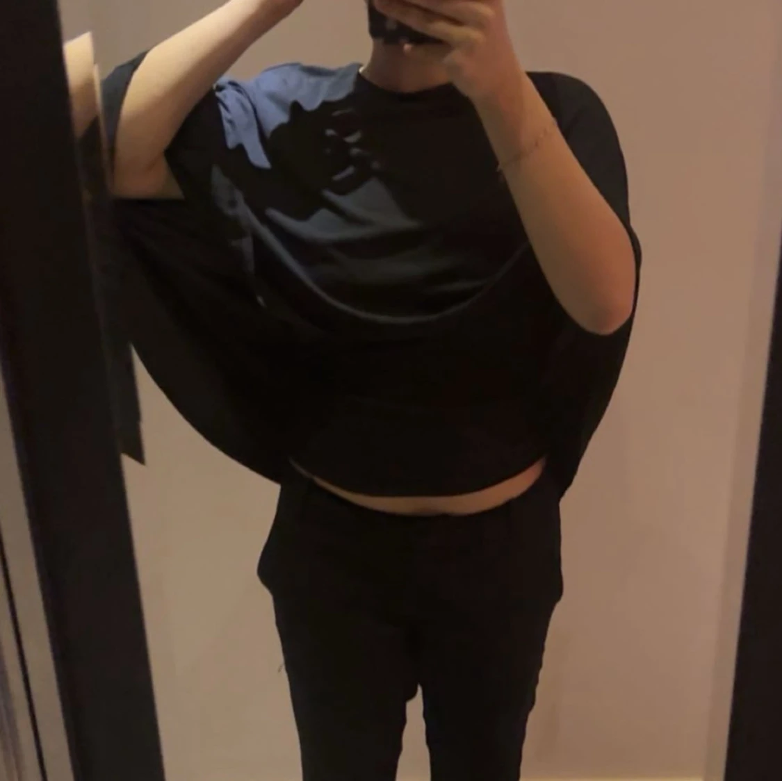 Svart cape topp från Gina Tricot i storlek XS. Toppens design har en cool, vid cape-liknande överdel som ger en unik siluett och croppad känsla. Materialet är mjukt och lätt, perfekt för dig som gillar statement-plagg med enkel stil. Rund halsringning och ärmlös look.