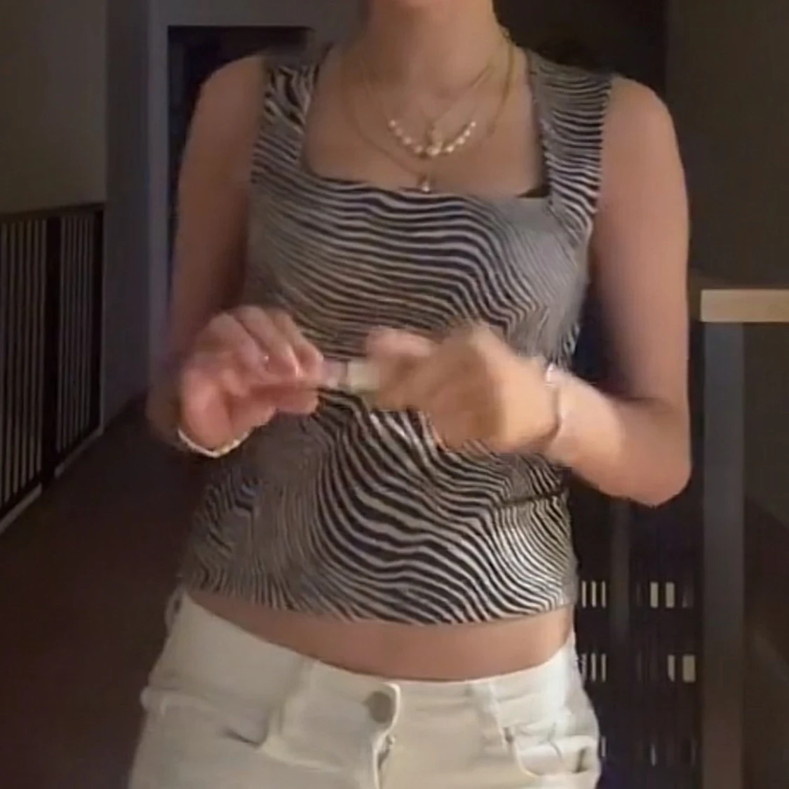 Säljer en croppad linnetopp med zebramönster i svart och vitt. Toppen har breda axelband och fyrkantig ringning, vilket ger en trendig och edgy look. Perfekt för dig som vill sticka ut med ett djurmönster i garderoben.