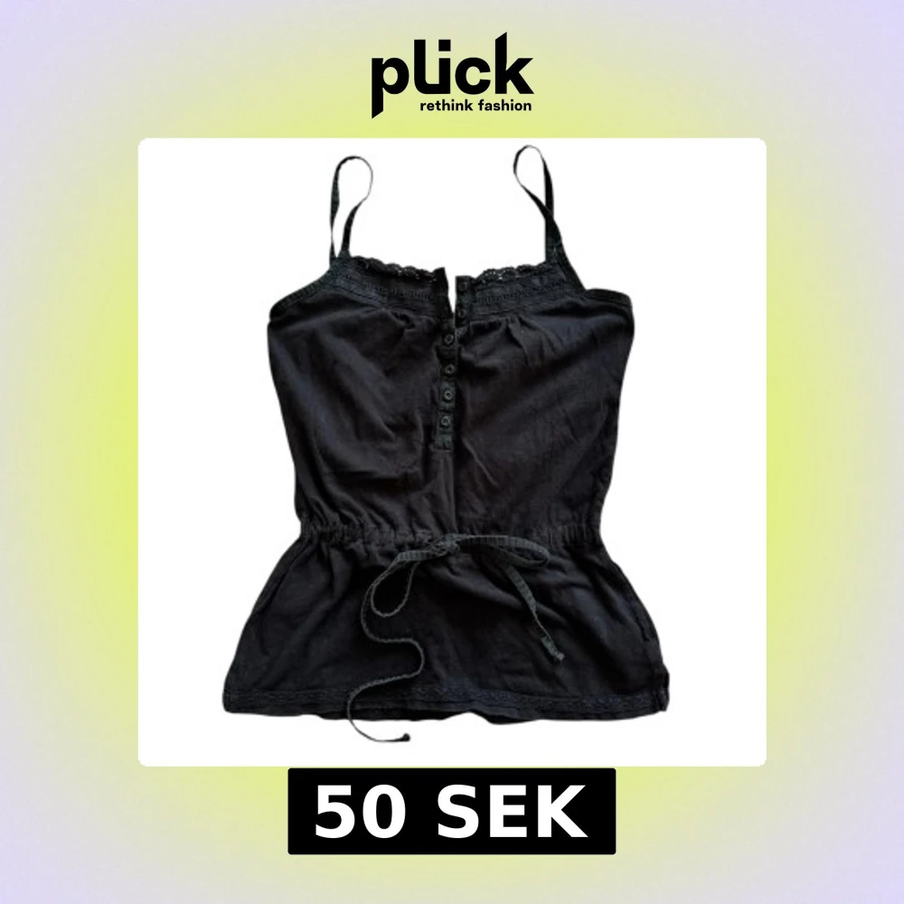 Snygg svart linne med spetsdetaljer vid halsen och knappar framtill. Den har smala axelband och ett knytband i midjan för en justerbar passform. Perfekt för varma dagar!