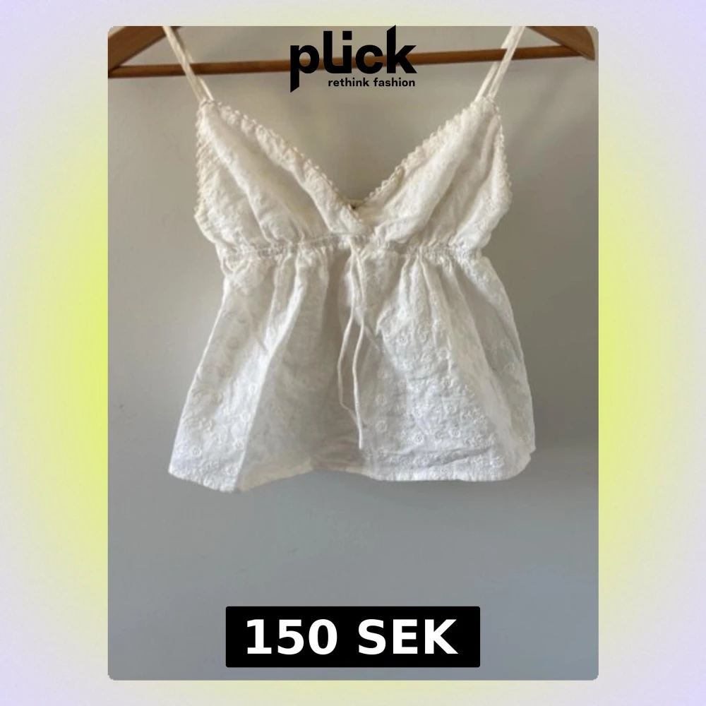 Söt vit linnetopp med tunna axelband, broderade blommor och spetsdetaljer. Toppen har v-ringning, justerbara axelband och en liten knytning framtill. Från subdued