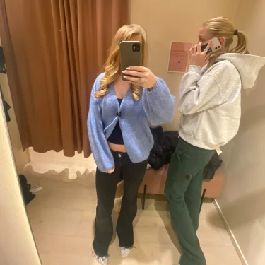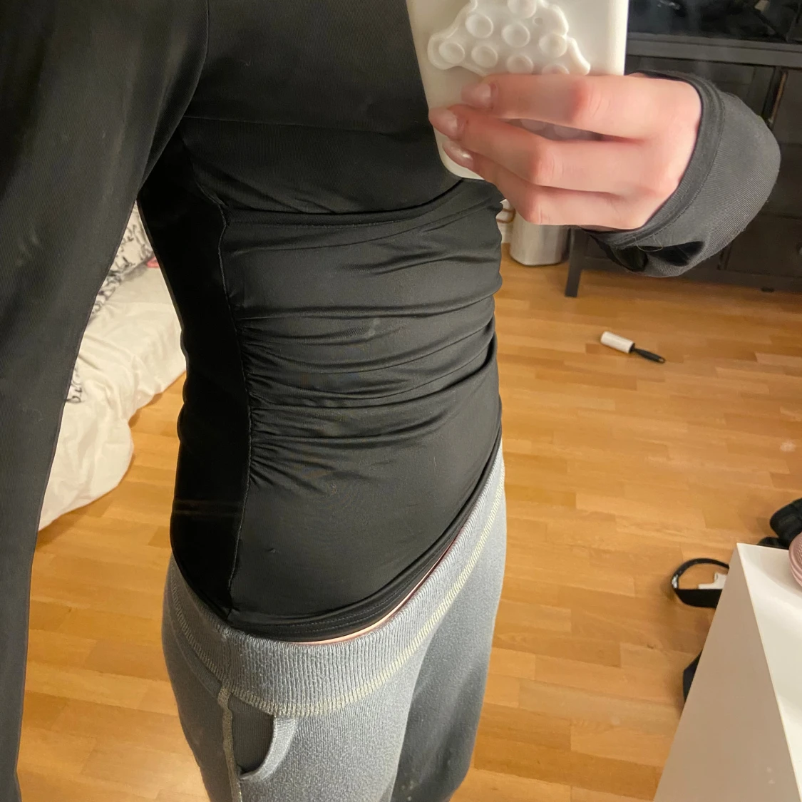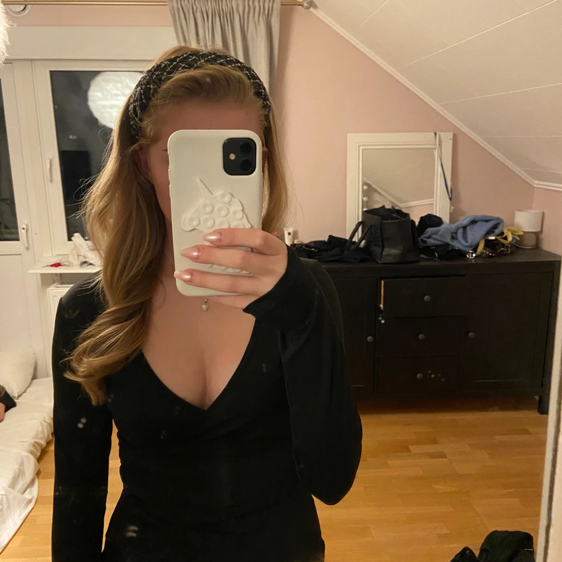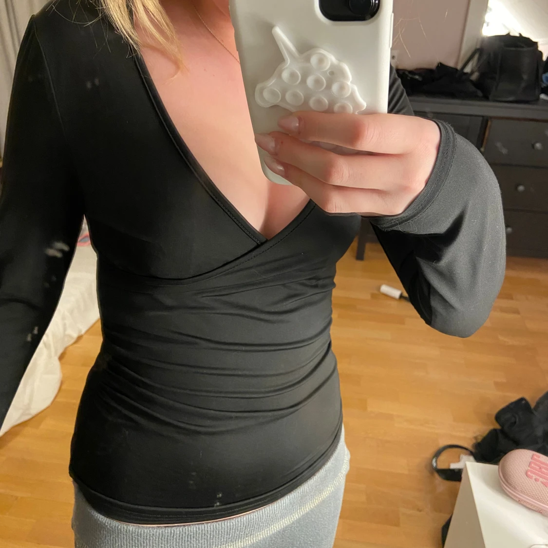 Säljer en svart omlottopp med djup v-ringning och långa ärmar. Toppen är figurnära och har en stilren, enkel design som passar perfekt till jeans eller kjol. Materialet känns mjukt och stretchigt, vilket gör den bekväm att bära hela dagen.