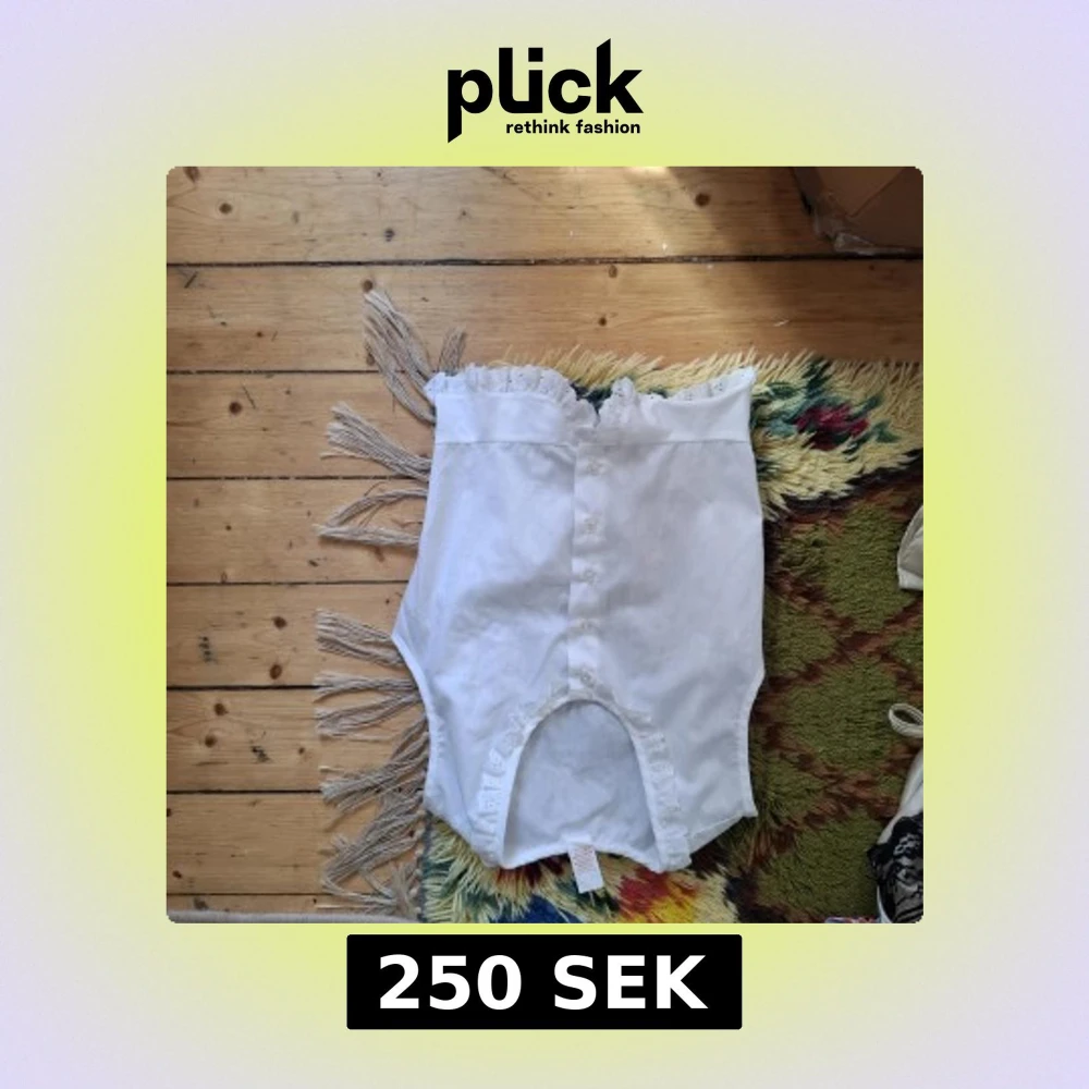 Säljer en söt vit axelbandslös korsett med spetsdetaljer upptill och knappar framtill. Den har även en knytning i ryggen för justerbar passform. Perfekt för dig som vill ha en romantisk och feminin look.