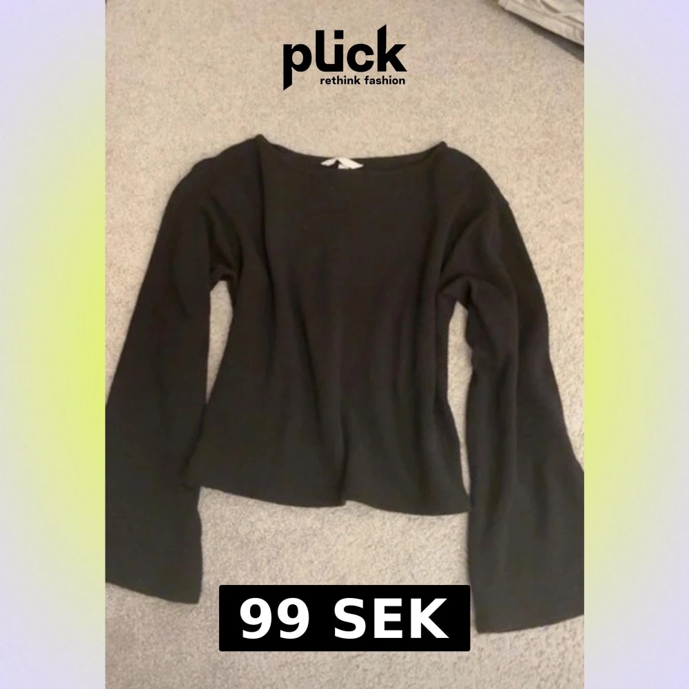 Säljer en svart stickad långärmad topp med utsvängda ärmar och rund halsringning. Toppen har en enkel och stilren design, är croppad i modellen och är tillverkad i ett mjukt stickat material som känns skönt mot huden.