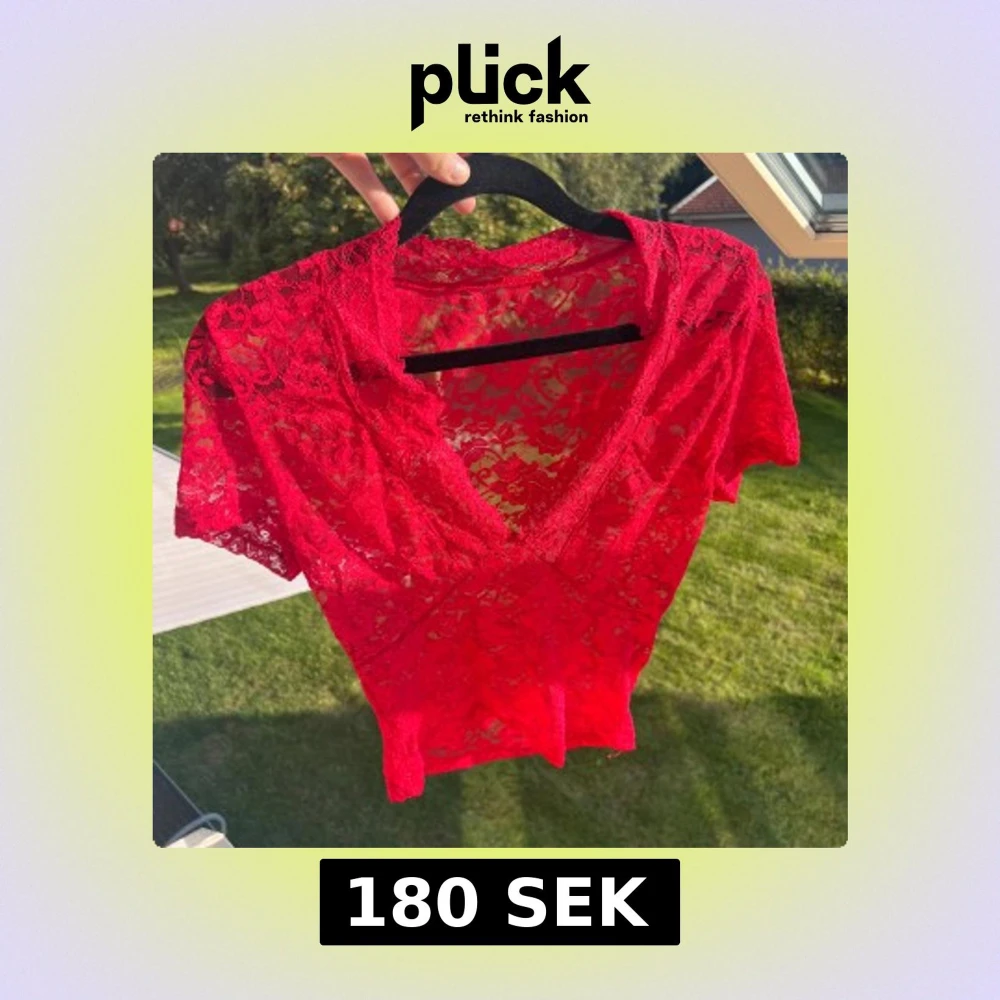 Säljer en röd, transparent spetsblus med blommigt mönster och djup v-ringning. Blusen har korta ärmar och är figurnära i modellen. Perfekt för dig som vill sticka ut med en färgstark och romantisk look.