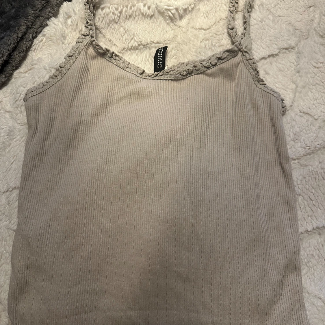 Supersöt beige linnetopp från Divided med ribbad struktur och smala axelband dekorerade med spets. Toppen har en liten rosett framtill och är perfekt för att skapa en chill och stilren look. Materialet är mjukt och skönt bomull.