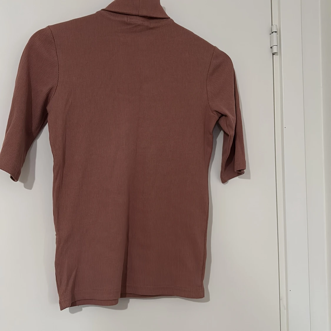 Säljer en brun polotopp med ribbad struktur och halvärm. Toppen har en hög krage och är figurnära i modellen. Perfekt för dig som gillar stilrena och enkla plagg med lite edge. Materialet känns mjukt och stretchigt mot huden.