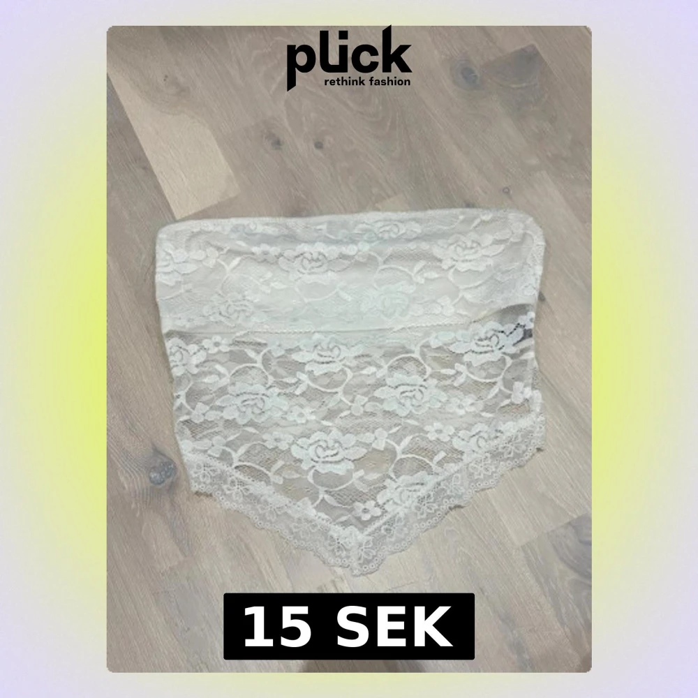 Säljer en vit bandeau tubtopp med spets och blommigt mönster. Toppen är axelbandslös och har en snygg spetskant nertill som ger en romantisk vibe. Perfekt att styla med jeans eller kjol för en cool look.