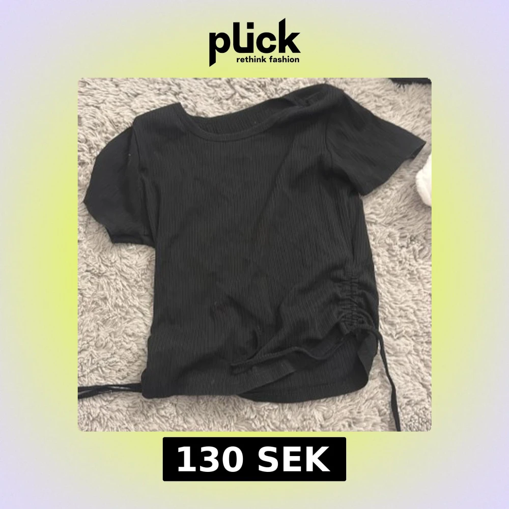 Säljer en svart, ribbad croppad topp med korta ärmar och snörningsdetalj i sidan. Toppen har rund halsringning och är i ett mjukt, stretchigt material som sitter snyggt på kroppen. Perfekt för dig som gillar en enkel men trendig stil.