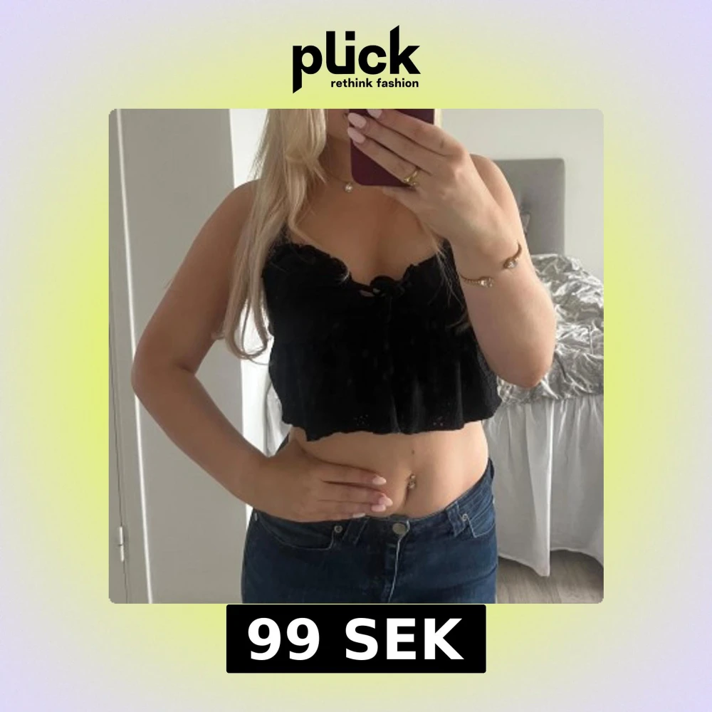 Supersöt svart croppad linnetopp med tunna axelband och spetsdetaljer. Toppen har snörning framtill och volangkant nertill. Perfekt för varma dagar och ger en romantisk vibe till din outfit.