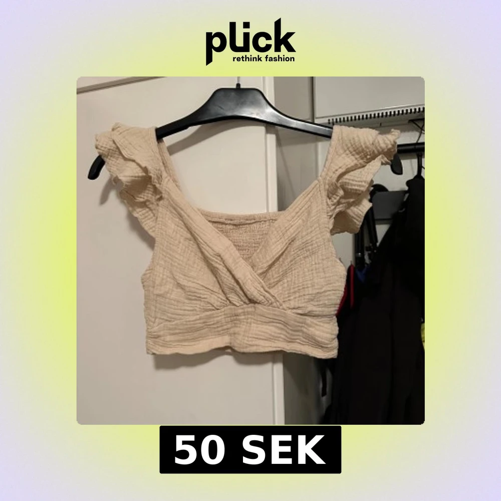 Säljer en beige linnetopp med omlott-design framtill och volangdetaljer på axelbanden. Toppen är croppad och har en lätt rynkad struktur i materialet som ger en chill och somrig vibe. Perfekt för dig som gillar ljusa färger och mjuka material.