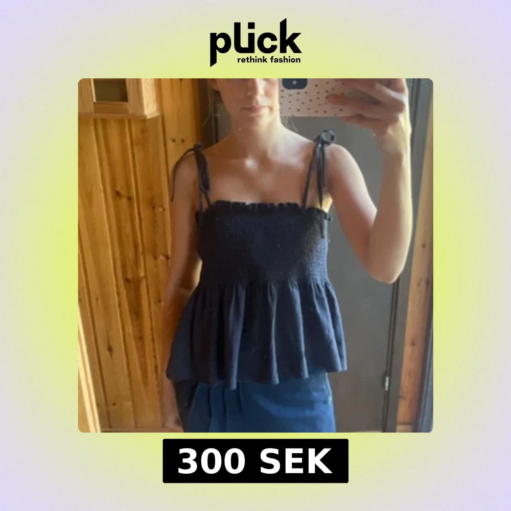 Supersöt mörkblå linnetopp med smockad överdel och volang nertill. Axelbanden knyts i rosetter på axlarna för en extra gullig touch. Perfekt till sommaren och lätt att matcha med jeans eller kjol.