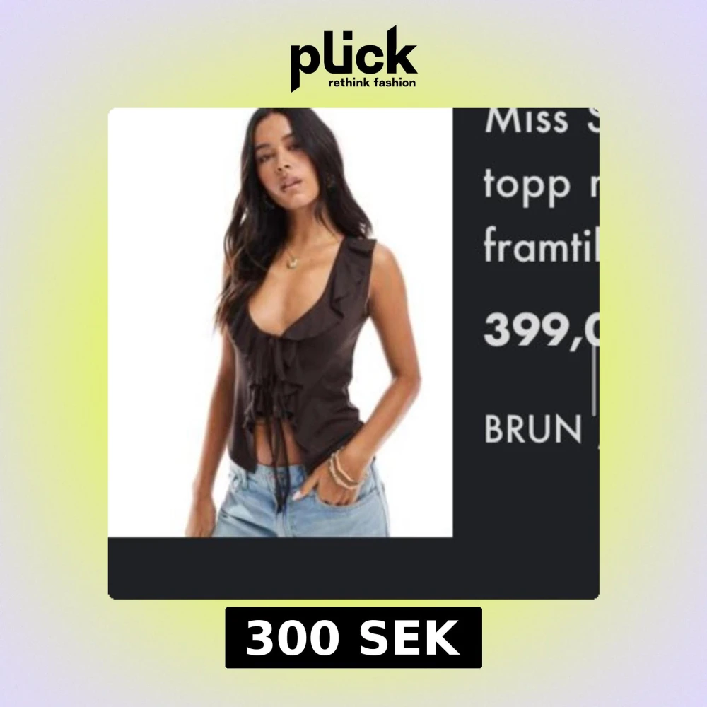 Supersnygg brun omlottopp från Miss Selfridge med volangdetaljer och snörning framtill. Toppen har djup v-ringning och är ärmlös, perfekt att styla med jeans eller kjol. Materialet känns lätt och skönt mot huden. EY ANVÄND!