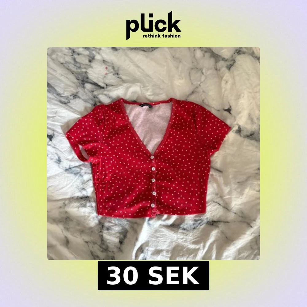 Supergullig röd croppad topp från SHEIN med små vita hjärtan över hela. Toppen har korta ärmar, v-ringning och knappar framtill. Perfekt för dig som vill ha en söt och trendig look med lite 90-talsvibe.