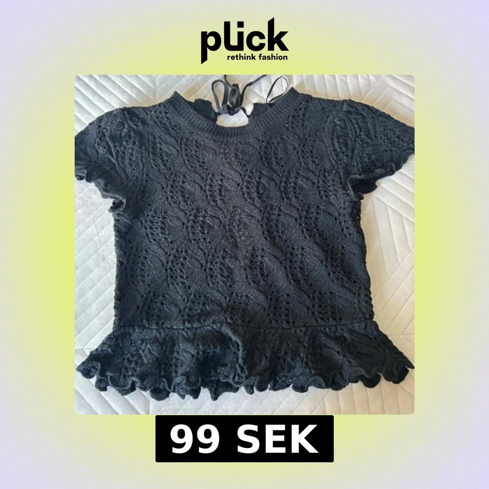 Säljer en svart blus i spets med korta ärmar och volang nertill. Blusen har knytning i nacken och ett fint mönster i spetsen. Aldrig använd