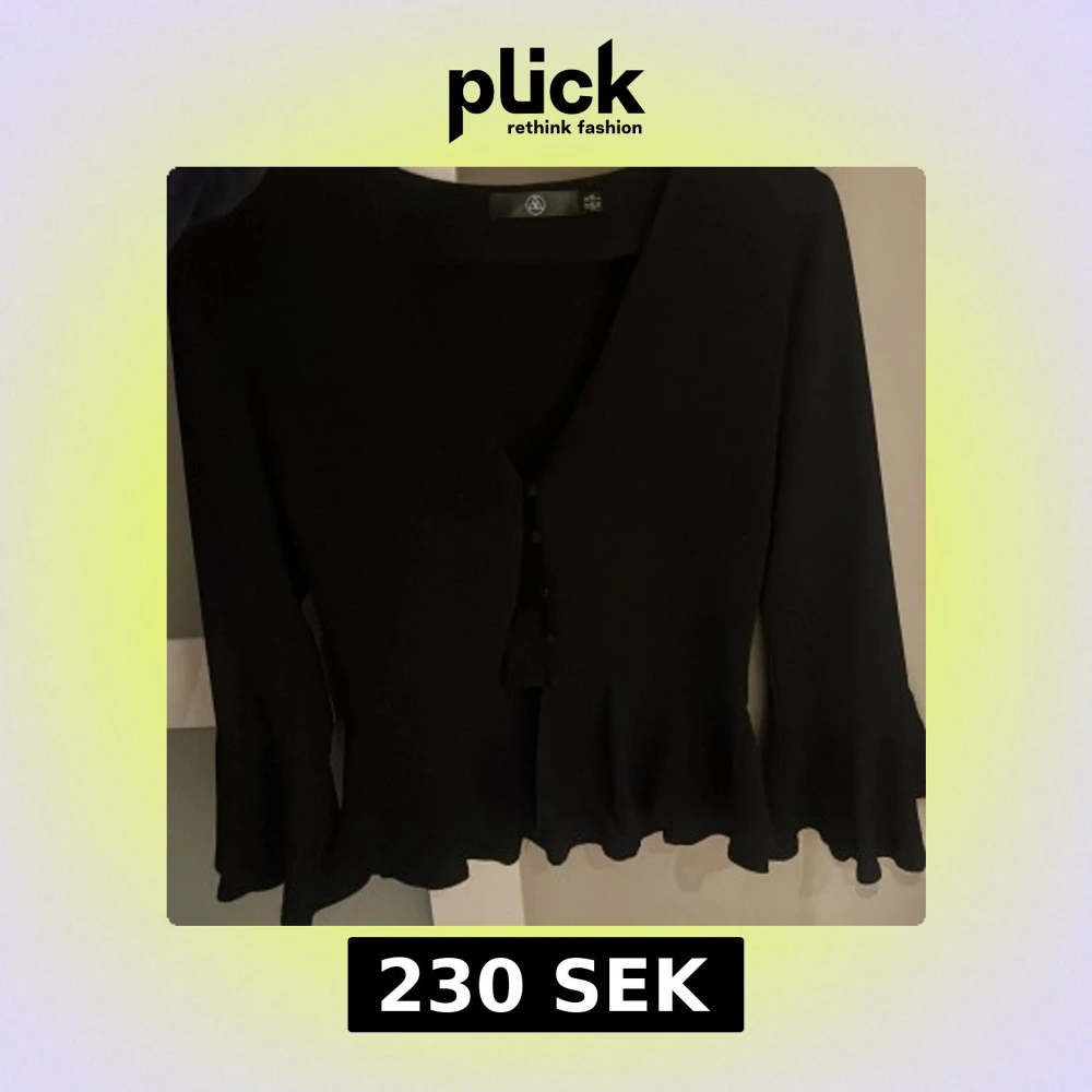 Säljer en svart blus med v-ringning, knappar framtill och volangdetaljer vid ärmslut och nederkant. Blusen har långa ärmar och en elegant, flowy passform som ger en cool vibe. Perfekt för dig som gillar stilrena plagg med extra detaljer.