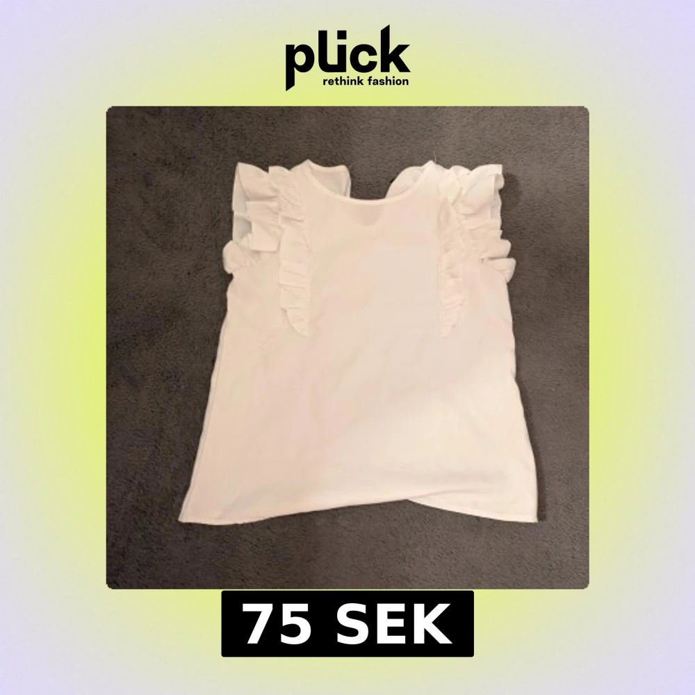 Säljer en söt vit blus med volangdetaljer på axlarna och ärmarna. Blusen har rund hals och är tillverkad i ett mjukt, lätt material som ger en skön känsla.