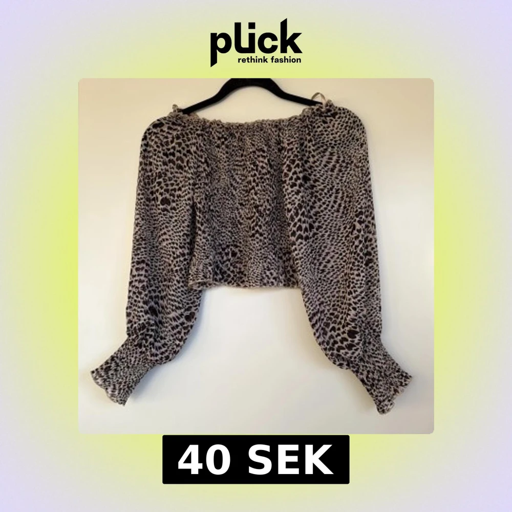 Säljer en snygg blus från Sisters Point i storlek XS med leopardmönster i beige, svart och lila. Blusen har långa puffärmar med breda smockade muddar och är gjord i 100% polyester. Den har en croppad passform och resår upptill för en offshoulder-look.