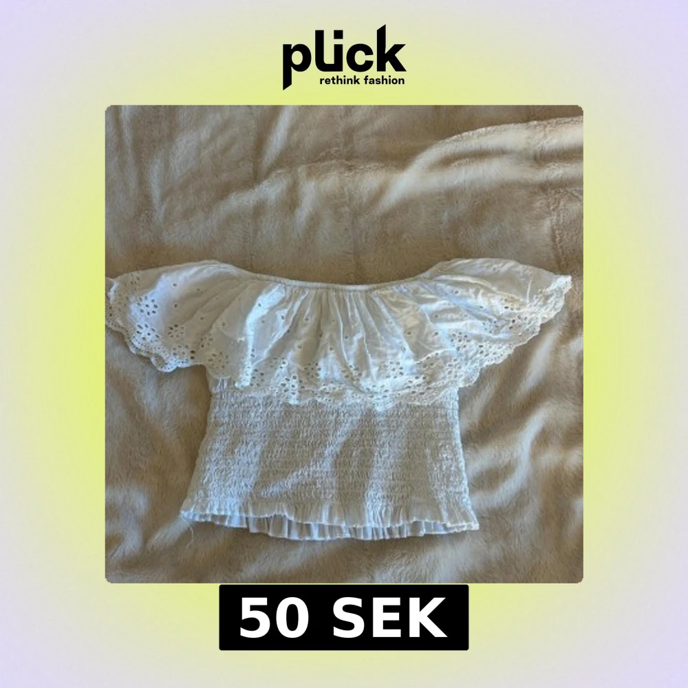 Vit offshoulder blus med vackra spetsdetaljer och volang. Den är köpt i Spanien så vet ej storlek eller märke men den sitter som en xs. Hör av dig för fler bilder.