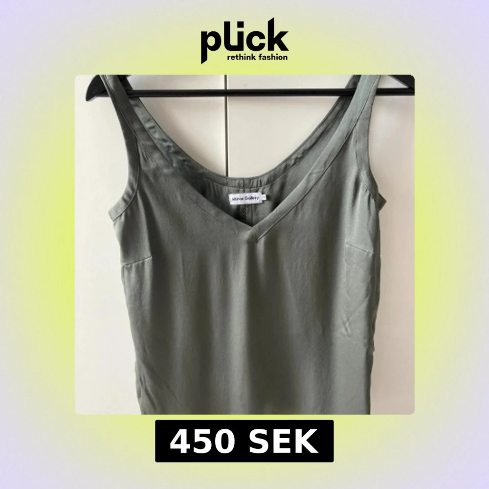 Säljer en stilren grågrön linnetopp från Ahlvar Gallery i storlek XS. Toppen har v-ringning och är ärmlös med en mjuk, glansig finish som ger en lyxig känsla. 93% silke nyköp 1500kr knappt använd, Perfekt att matcha med jeans eller kjol för en clean look.