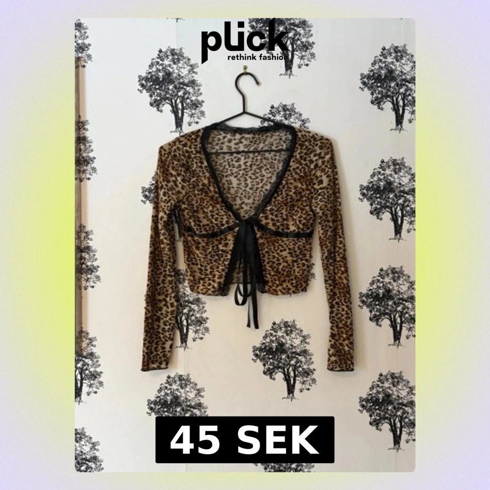 Säljer en croppad leopardmönstrad topp med långa ärmar och djup v-ringning. Toppen har svarta spetsdetaljer längs urringningen och ett snyggt knyt framtill. Materialet är tunt och stretchigt, perfekt för att sticka ut.
